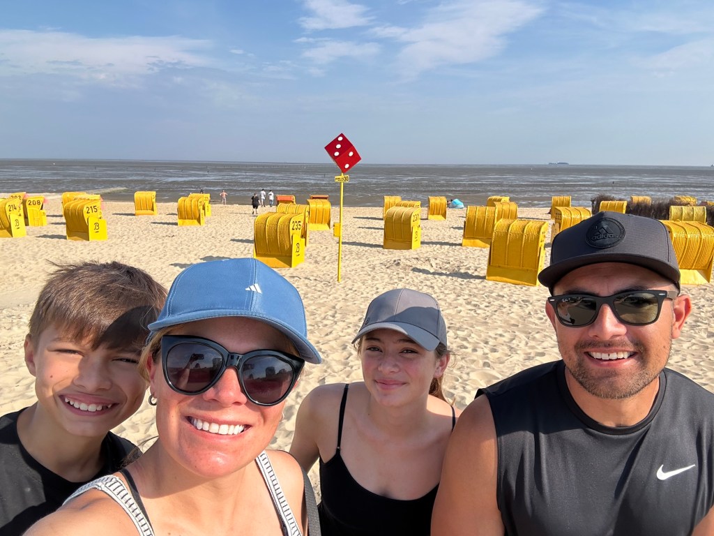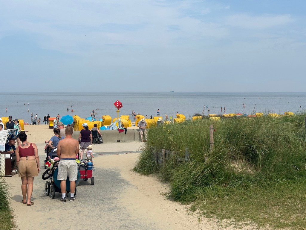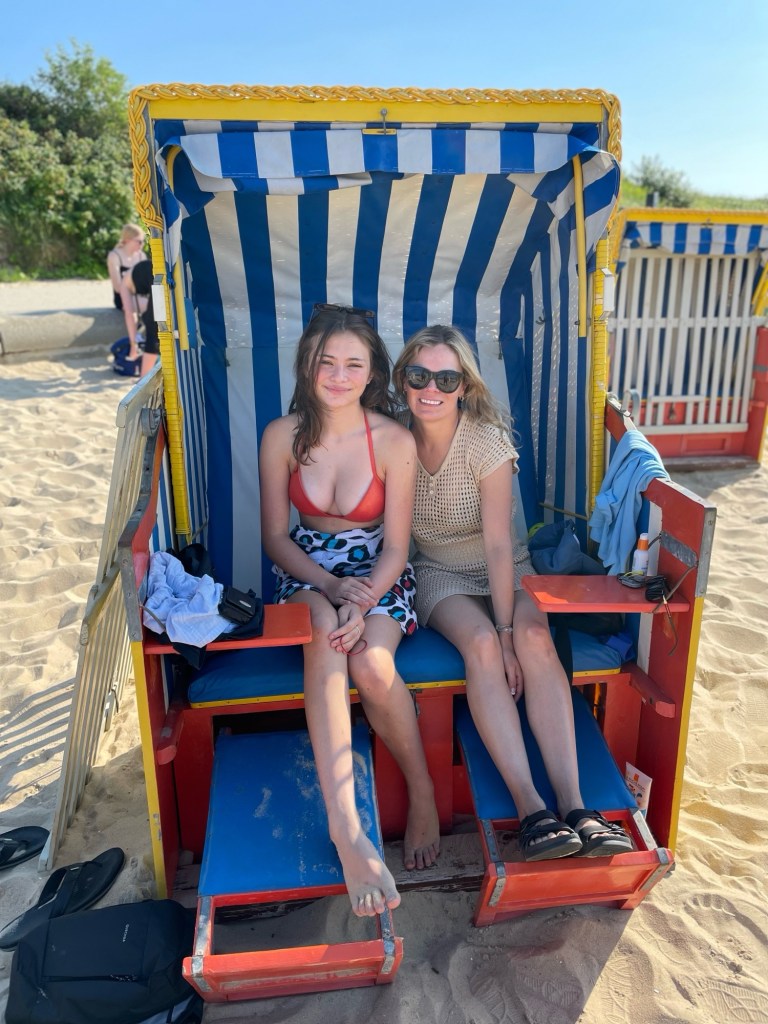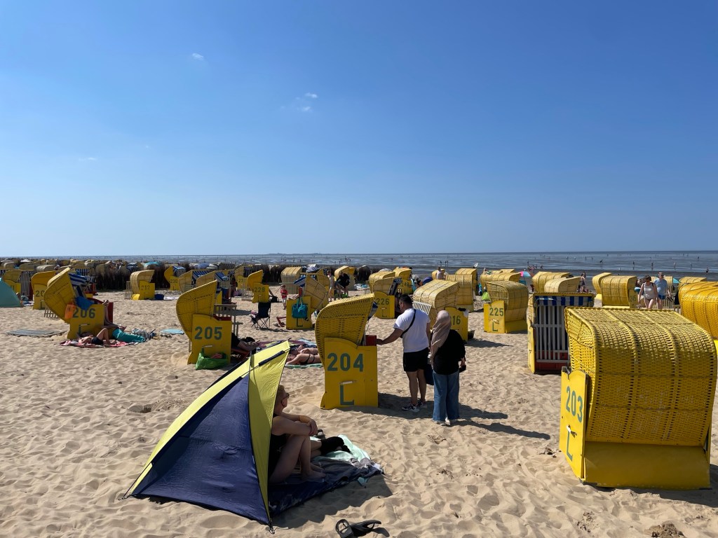 Finally, we made it to Cuxhaven, checked into our hotel, and headed to Dühne Beach, only about a five-minute walk away. We first noticed the yellow beach huts at the beach and promptly rented one. These little huts are essentially two-person benches with a built-in umbrella and side wind protection. You can turn them based on where the sun is shining from and they can recline and have built-in full rests—genius! The whole thing only costs €8 for the day, which we considered a huge bargain.
