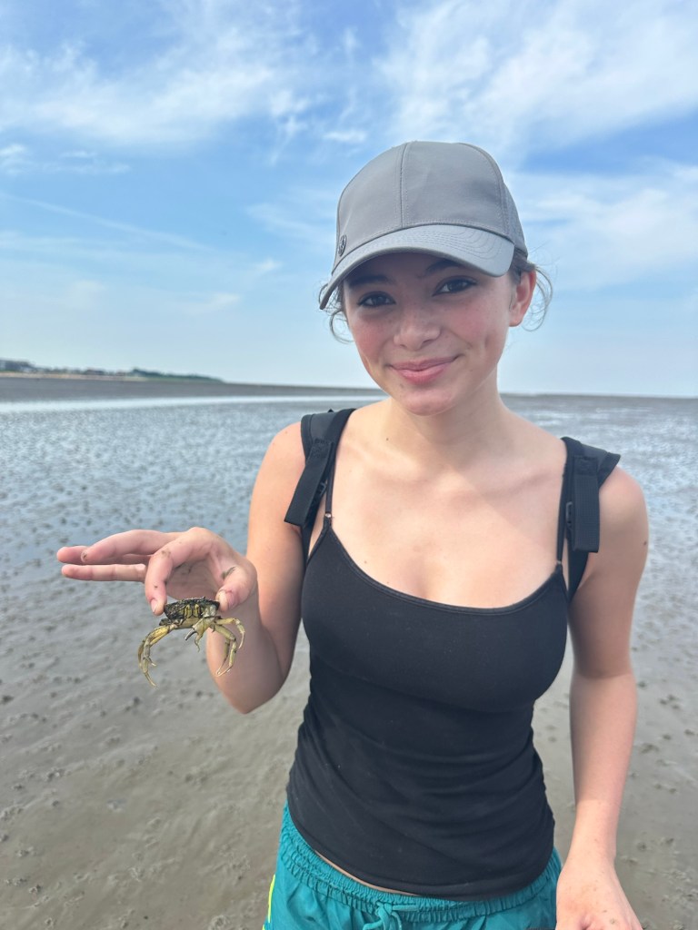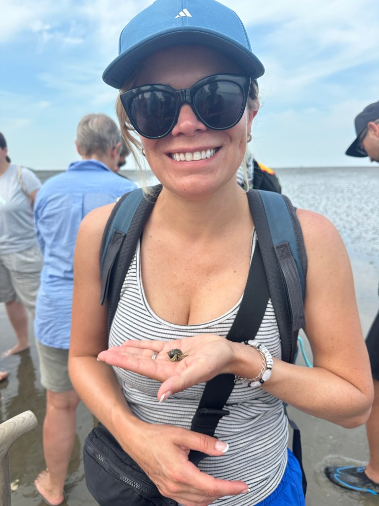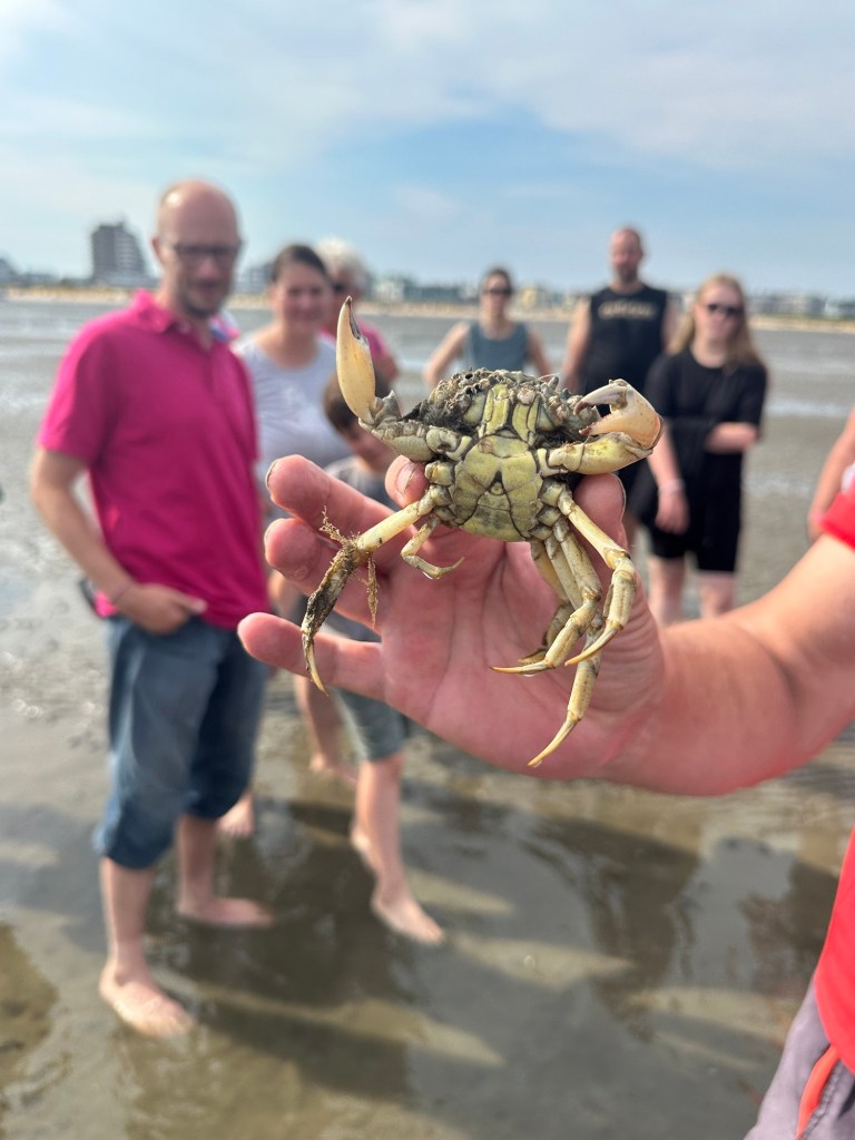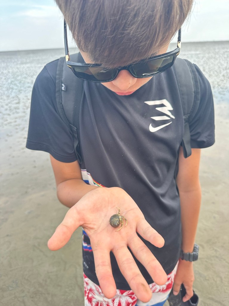 The hike took about two and a half hours and covered 2.5 km, but we stopped frequently to learn about the sea bed and the creatures that live in it. The first animals we came across were shore crabs. Lucky for us, we found plenty and even one female, which the guide said was very rare; only 1 in 500 shore crabs is female and he said he was really happy to see it. Next, we came across a family of hermit crabs scuttling across the sea bed. Kai told us that this is not their habitat at all and that they are extremely rare here. For us, it was the first time seeing a hermit crab not being sold in a cage in a beach-side store, so it was really cool. Kai taught us how to dig for mussels and clams, and we saw tons of baby shrimp.