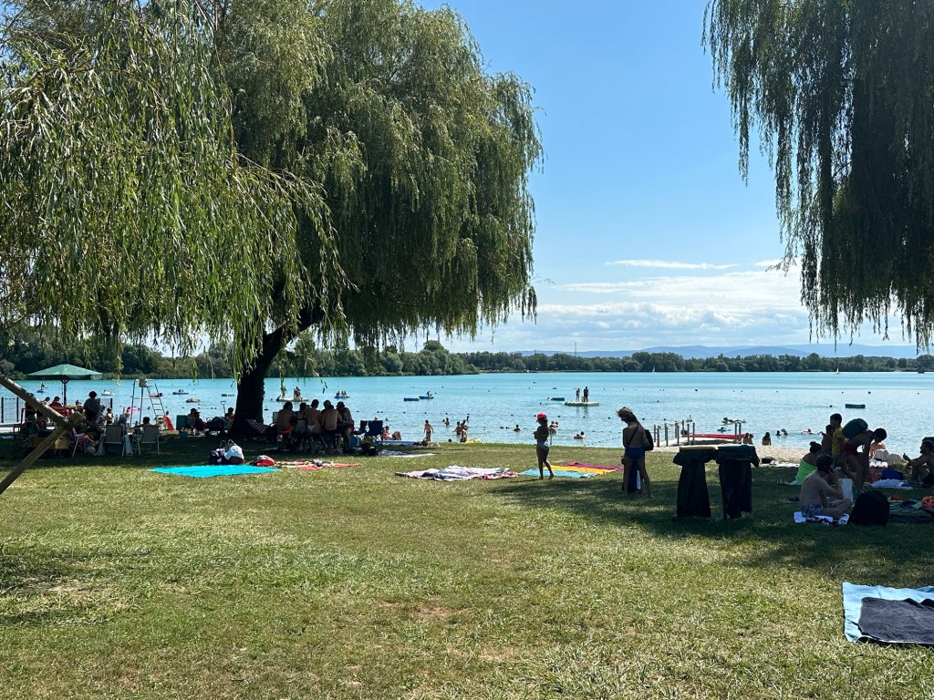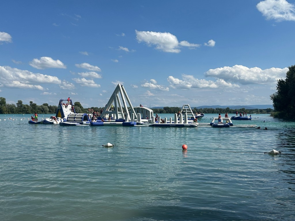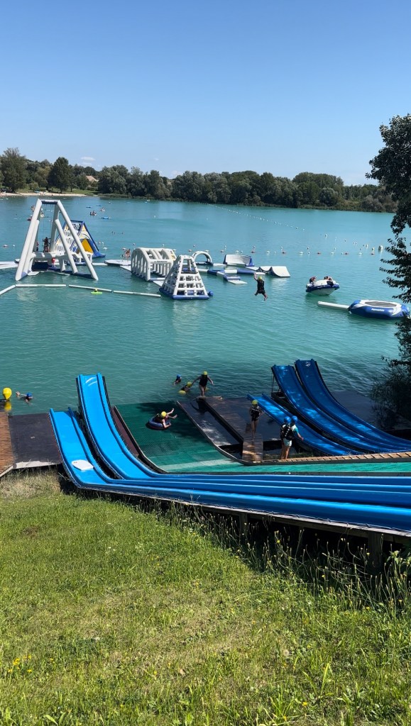 Friday, I was off, so I took the kids and their friends to Total Jump, just across the border in France. Total Jump is an aqua park on the lakefront of Bassin de Mouettes, an artificial lake. Half of the park is an inflatable obstacle course, and the other half are mega slides that launch you into the lake. These slides are so giant and you are launched so high that you must wear a life jacket and helmet!
