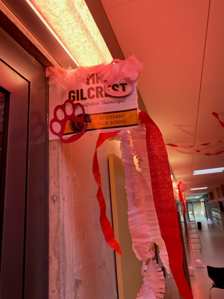 Brooklyn went to school on Sunday because Homecoming is next weekend, so next week is Spirit Week. The Class Council was responsible for decorating the Junior hallway in honor of their theme this year: The Pink Panther. They even decorated Matt’s office door and sign.