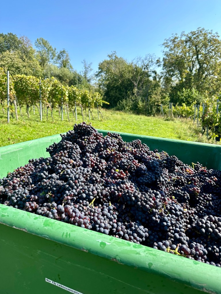 Picking grapes is hard work! You have to stand on a steep slope, cradling your bucket between your ankles and leaning over to clip the grapes. It was also so sticky! The black riesling grape is particularly sweet, and our hands and arms were coated in a sticky syrup in no time. One picker, who had worked on Wednesday when they were harvesting white grapes, said it wasn’t sticky at all, but they had to pick on a slope so steep that some people slipped down the hill several times. Your experience can really vary depending on the type of grape you are working on.