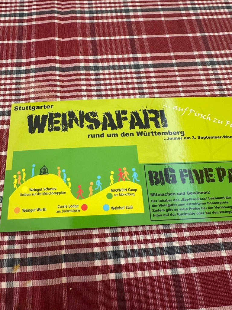 We met two other couples for the safari, where you are given a passport for €20 and must get stamps from the “Big Five” Stuttgart wineries. The stamps are received after having a glass of wine at each station, which is decorated in honor of one of the Big Five animals.