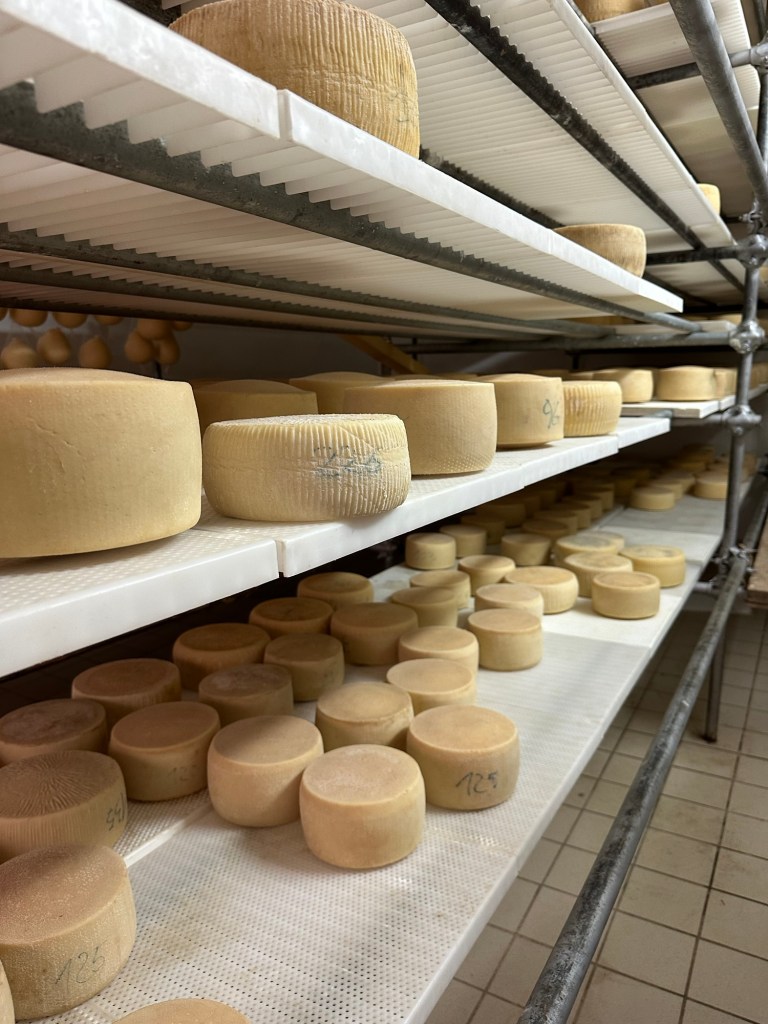 After the milking room, we were taken to the cheese aging room, where we learned about the different types of cheeses made here besides mozzarella, how they are made, and how they are aged.