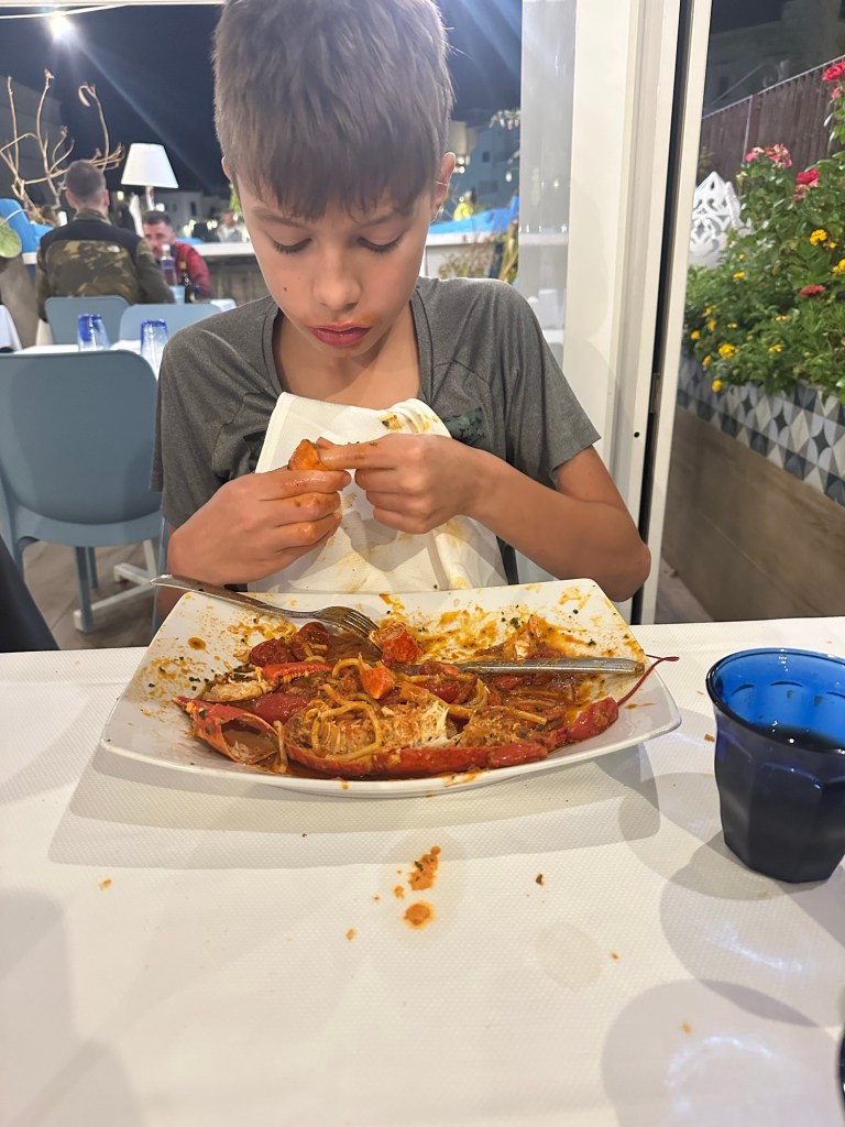 After sunset, we had dinner at the very same restaurant as the night before. The kids wanted to repeat the “best dinner ever” again, and it didn’t disappoint. Funnily, the waiter from the night before remembered the mess Ryan made with his dinner and even brought him a bib. 🤣