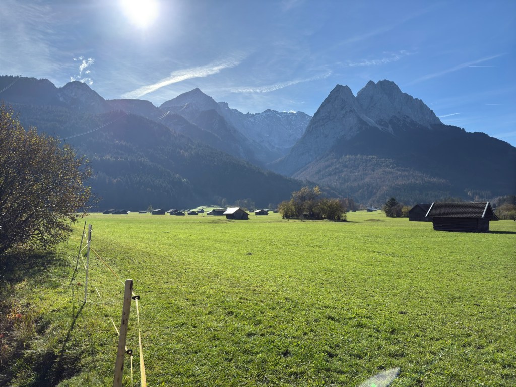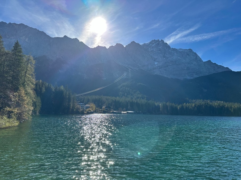 As we left Garmisch, the route took us through steep mountain paths that even the e-bikes struggled on. Thank goodness we were not on regular bikes! Finally, after about an hour, we were out of the woods and at the lake. It was so pretty! We biked the trail to the opposite side and got some photos of the lake with the Zugspitze in the background. Sadly, though, there was no beautiful fall foliage at Eibsee! All the trees surrounding it were pine, so it was as green as it could be 😂. I texted my friend and asked her which lake she had been at a few weeks prior- it was Reisersee, right around the corner from the hotel.