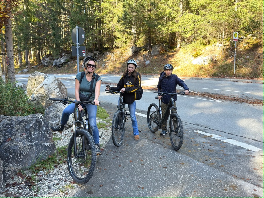 When we woke up Saturday morning, it was another absolutely gorgeous day. The “grown-ups” (my parents, aunt, and uncle) wanted to go to town and shop, but we wanted to do something outside in the beautiful weather. We saw the hotel was renting out bikes, and Ryan had a biking requirement he needed to fulfill for Boy Scouts, so that sealed the deal for us. We grabbed some e-bikes and headed out to Lake Eibsee, our destination.
