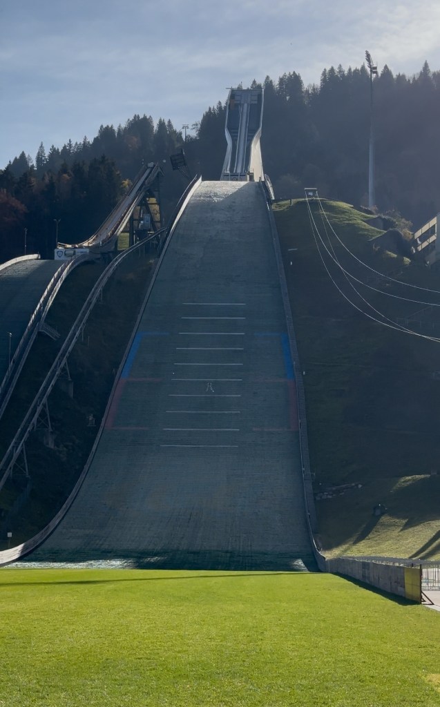 After leaving the hotel, we quickly stopped at Partnach Gorge in Partenkirchen. The entrance is right by the Olympic Ski Jumping stadium, and we arrived just as some jumpers were practicing. We got to see them go off the jump from right in front of it. It was so cool!