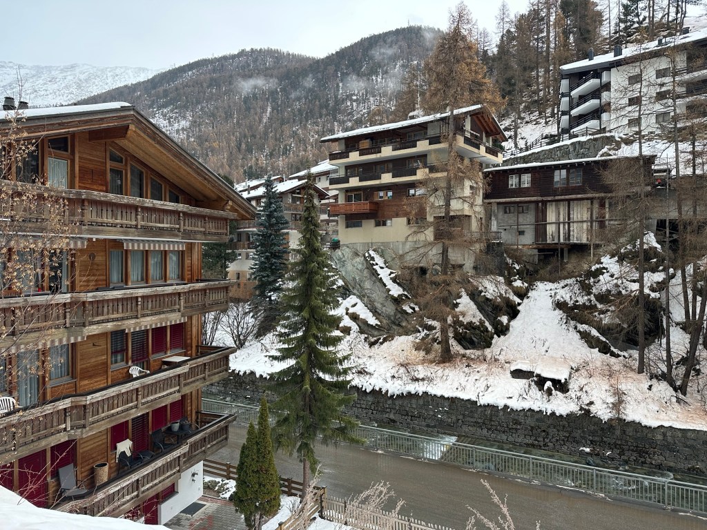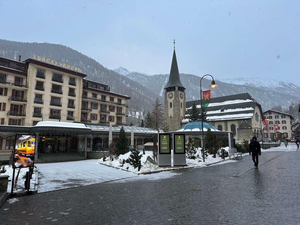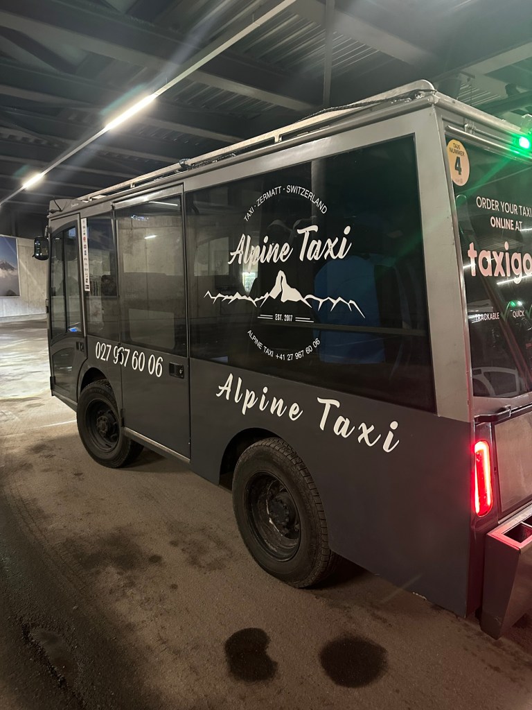 Zermatt is entirely car-free, so you have to take a train or taxi into town from Täsch, the next village up in the valley. We were so late that we took the taxi van, which drove us to the edge of Zermatt, where we transferred into one of their little Zermatt taxis. Finally, we arrived and got into our rented apartment around midnight.