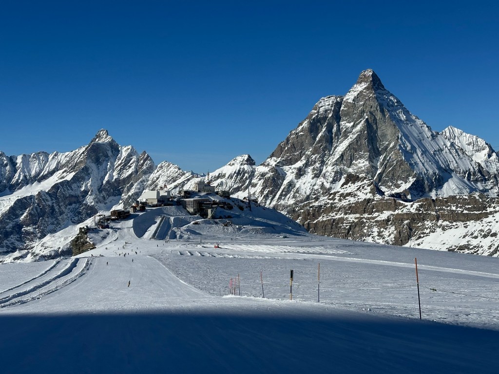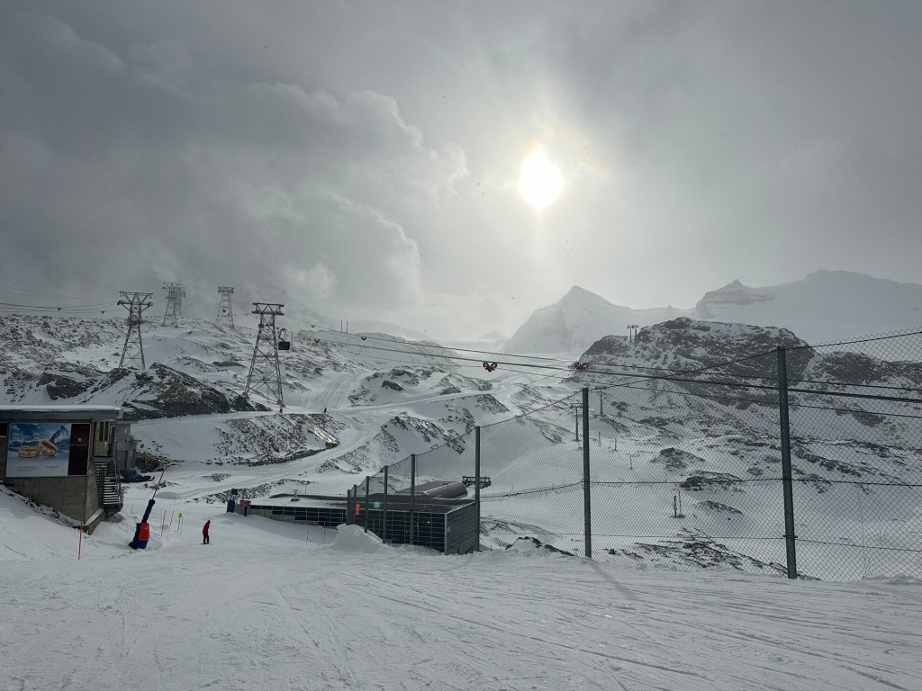 Unfortunately, the weather conditions were not ideal. It was cloudy and snowing down in Zermatt. When we reached the top of the mountain, it was so windy that the chairlift to the main ski area closed, leaving only one trail open. Even though we knew we were just in front of the Matterhorn, we could not see it as it was shrouded in clouds.
