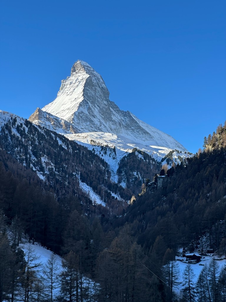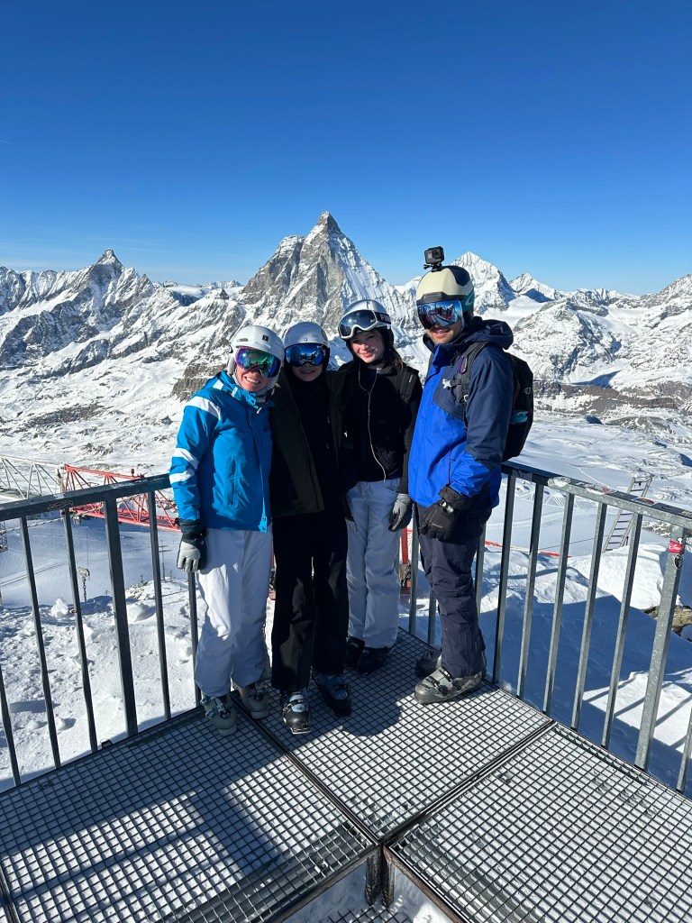 Petr took us down the one open slope several times and gave us lots of feedback on ways we could improve. The slope we were on felt challenging but not too bad. My anxiety has been really high in recent years, so I was shocked when he told me that we were actually skiing on a black slope. I’m glad I did not know that beforehand, or I probably would not have gone down. Petr definitely helped ease my anxiety. Since this was the only trail open that day, everybody was skiing on the same slope. We even saw some people we knew from Stuttgart! But that also meant the slope turned slushy and formed many moguls because it was so crowded. Ryan asked to do a jump and, unfortunately, wiped out. From where we were, all we saw were his skis flying through the air, which was scary. Fortunately, when we got to him, he only had a bloody nose and could put his skis back on to ski away. However, he was pretty shaken up and did not want to ski anymore that day. At that point, it was also time for our lesson to be over, so we said goodbye to Petr, grabbed a late lunch at the ski lodge, and jumped on the gondola back to Zermatt.
