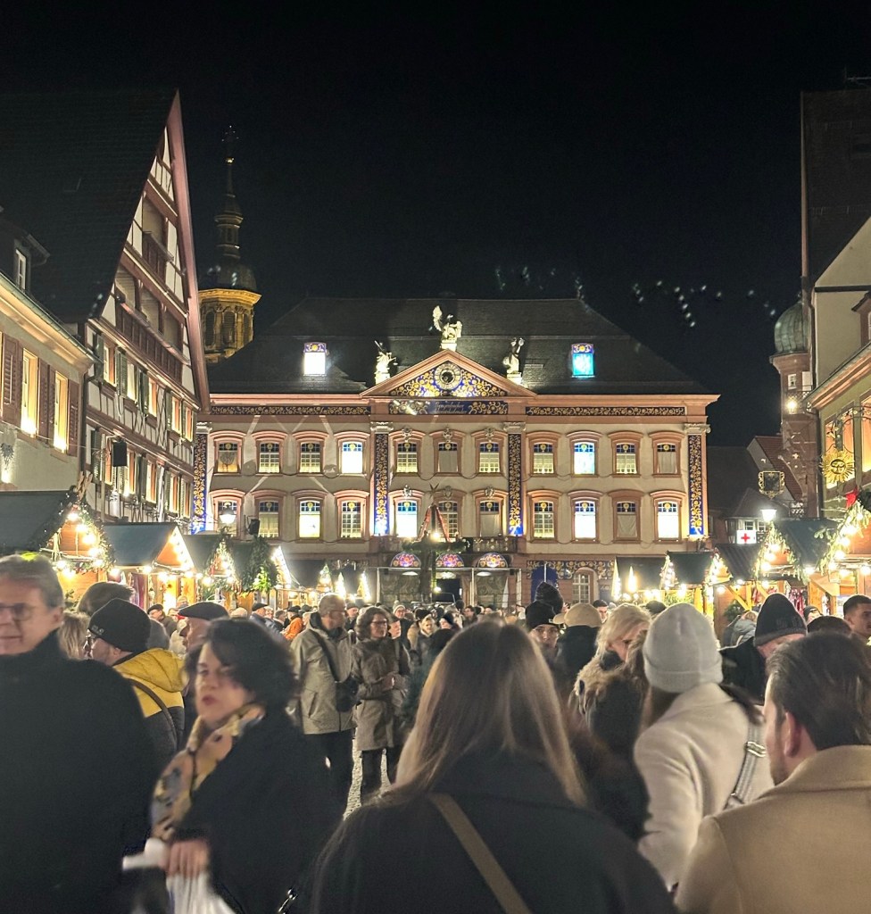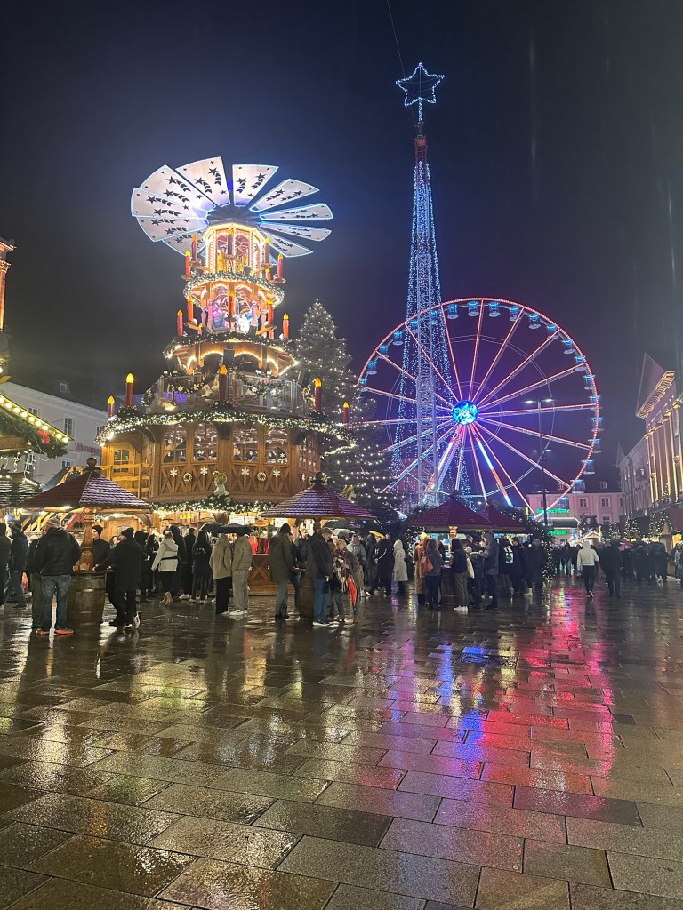 On Monday night, a friend and I visited Karlsruhe, about an hour west of Stuttgart, to check out their market. Karlsruhe is actually the first market our family visited during our first December in Germany in 2021. Covid was still a big thing, and we were wearing masks and social distancing at the time, so it was cool to see the market under “normal” circumstances. In typical German fashion, though, it started pouring rain once we arrived. We bundled up, though, and persevered.