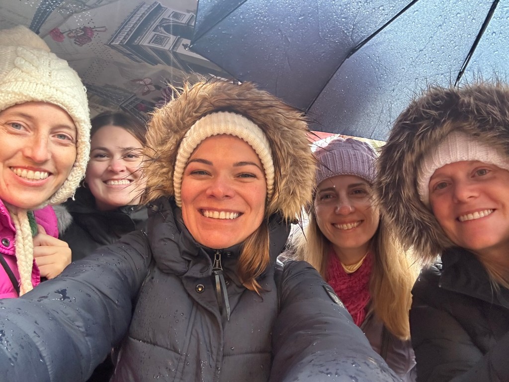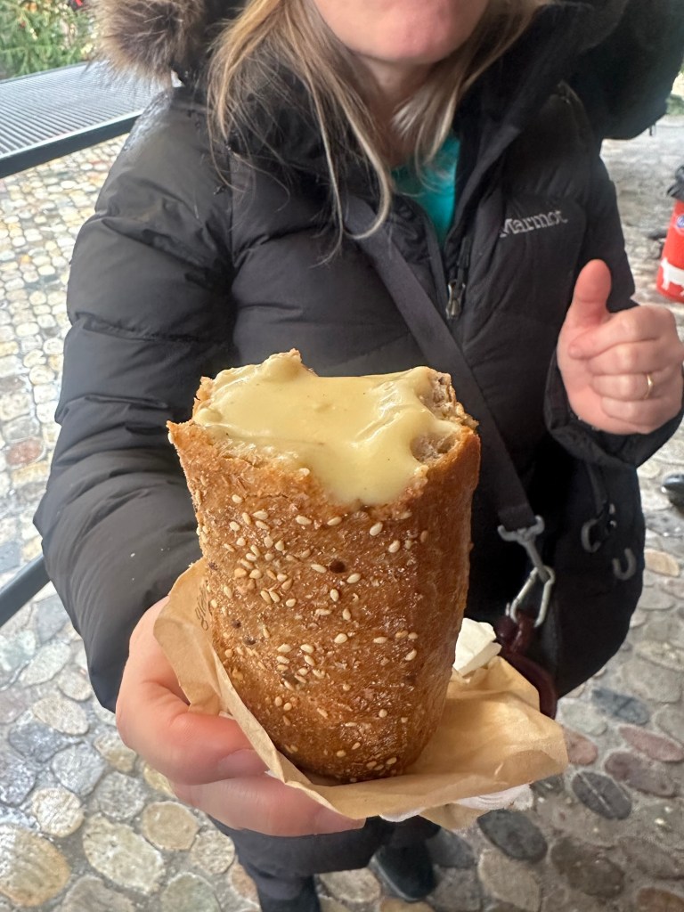 It was still sunny when we arrived, but by the time we parked the car, it had started raining, and it poured the entire time we were there. We still got to see both markets, eat some fondue, and have a gluwein before returning to the car.