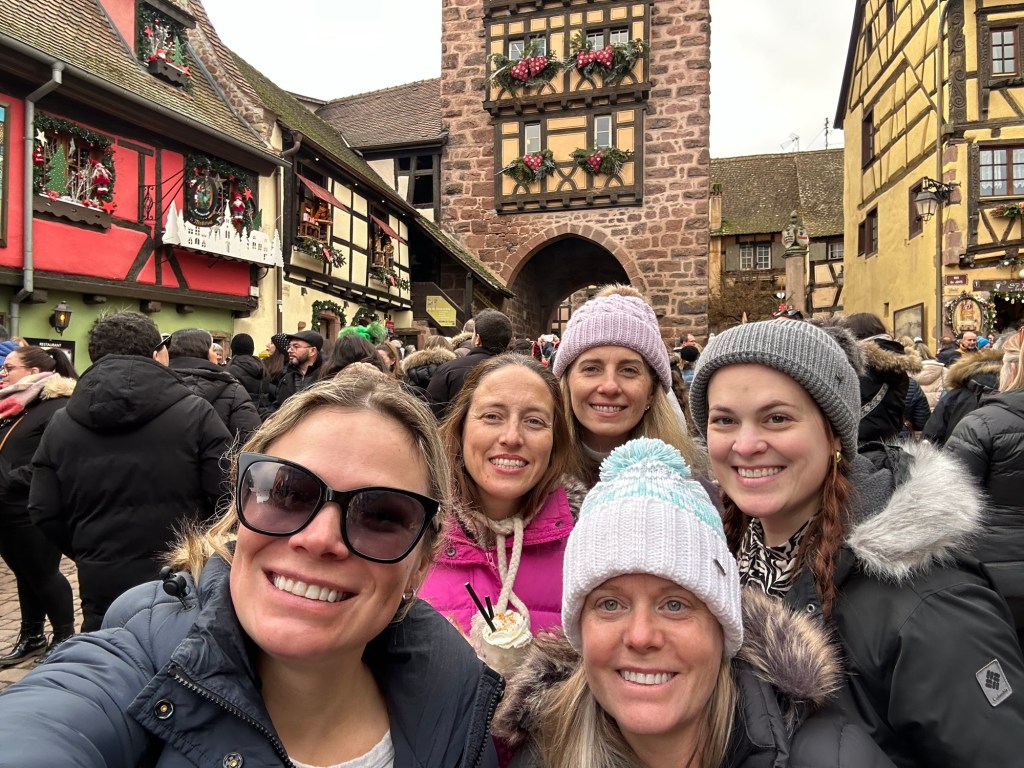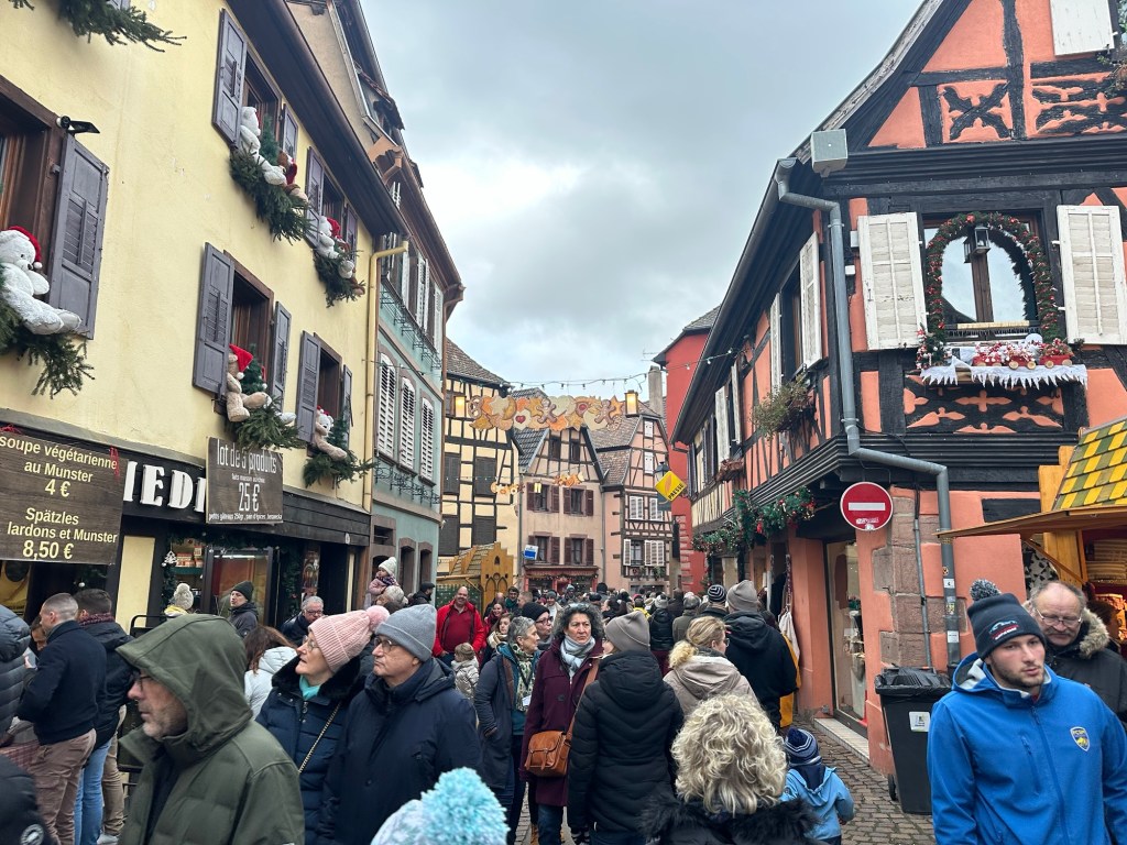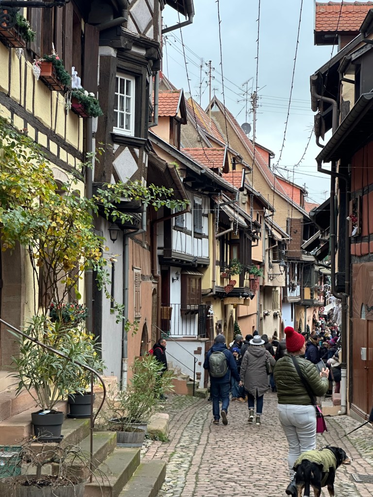 Our next stop was Riquiwihr, France, a walled medieval village. I visited the Christmas market in 2022 with Matt and Ryan, and on the day we went, it was so foggy that we could barely see the buildings and couldn’t see the surrounding countryside at all. This day was clear and sunny, so I was glad to have a second chance to check it out. The village was packed, and it took us an hour to walk the short main street from end to end, but we managed to find lunch and a mug before getting back in the car.