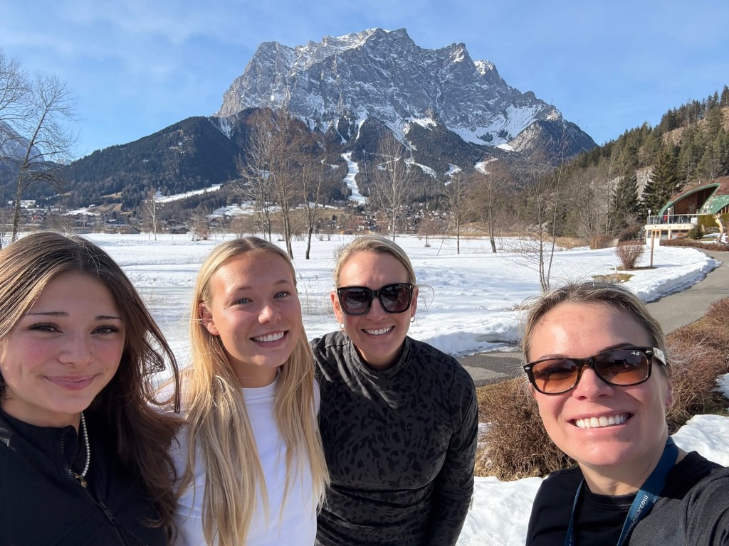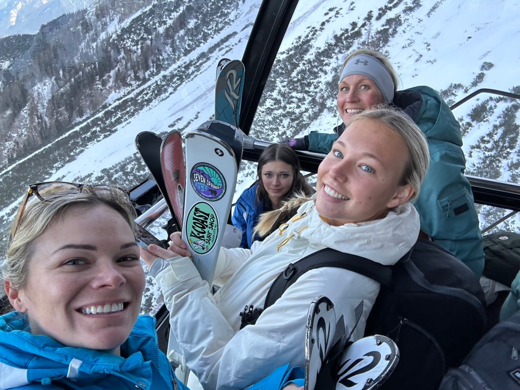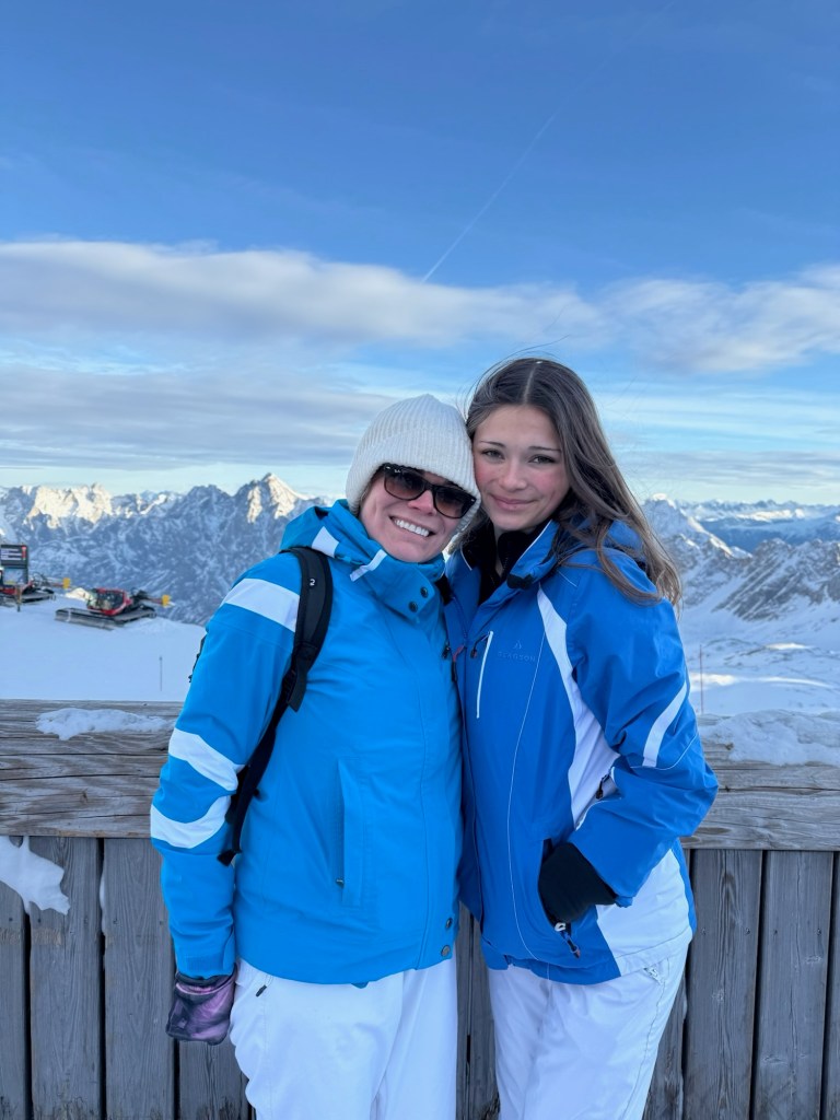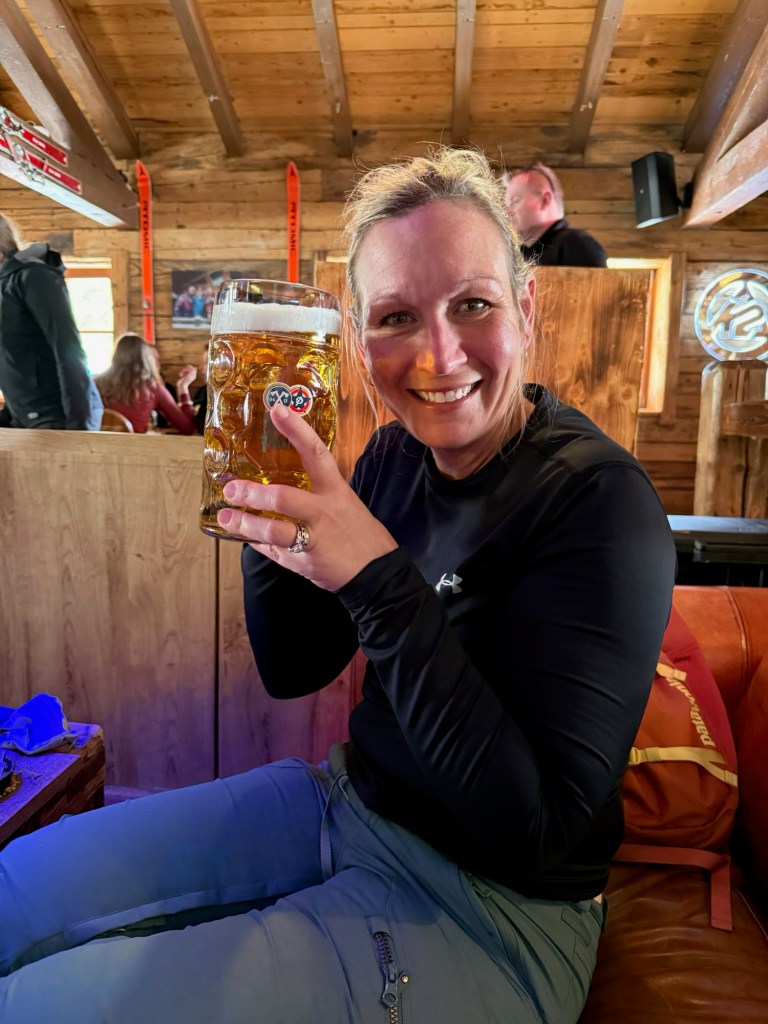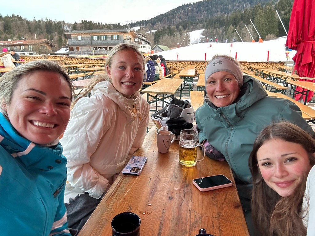 We were up early and at the slopes on Saturday by 9:30am, this time at Garmisch Classic. As opposed to skiing at Zugspitze, Garmisch Classic was packed! We had to wait almost 20 minutes just to board the gondola to reach the top. Once there, the slopes were pretty crowded, and as it was a warm day, the snow conditions alternated between icy, slushy, and mogul-ly. We also discovered that the Women’s World Super-G qualifying race was being held on the Kandahar slope. Hence, that slope was closed to regular skiers, and even more spectators were pulled up to the Garmisch Classic for the day. Despite the crowds, it was still a beautiful sunny day, and we enjoyed skiing all day except for a lunch break in one of the many lodges. At the end of the day, Elsie and Brooklyn took Kathy to the highest point in the resort. I was not excited about going down some of the more challenging slopes, so I started my aprés ski break a little early ☺️.