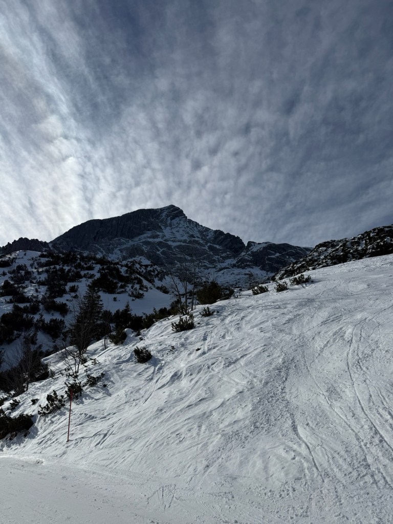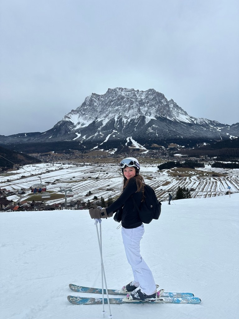 The weather started as rainy at the base, and then, as we ascended one of the two gondolas we needed to take to the top, it started snowing. At the top, it was almost white-out conditions, and the snow was a super thick powder, definitely different from our last two days’ skiing conditions. It wasn’t too crowded, but the fresh snow made some of the slopes pretty mogul-ly. As expected, we started at the top and skied back and forth across the mountain, taking in some fantastic views of Zugspitze and the valley below. The entire trip took us almost an hour. As we skied, the sun miraculously started to come out, and it turned into a beautiful day.