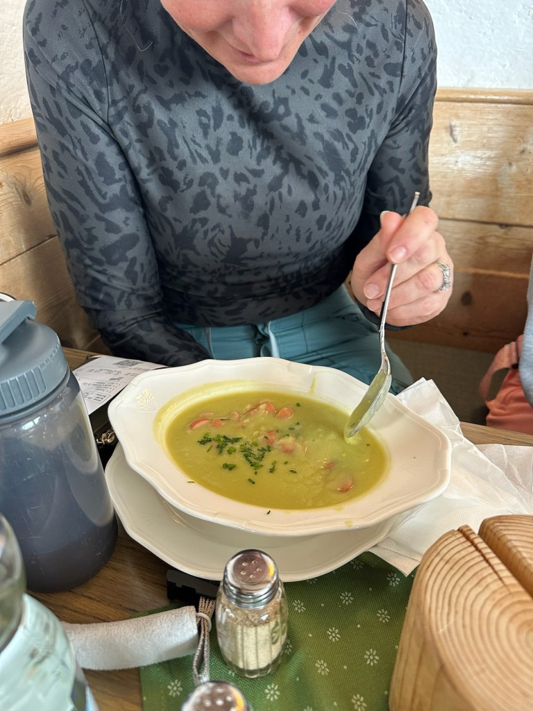 We stopped for lunch in one of the mountain huts, where we all got lunch and drinks for less than $50. It always amazes me how much more affordable all the skiing is here. The funniest part of lunch was how Kathy wanted to order something “new” and ended up with a green split-pea soup with cut-up hot dogs in it! That was definitely a first for both of us!