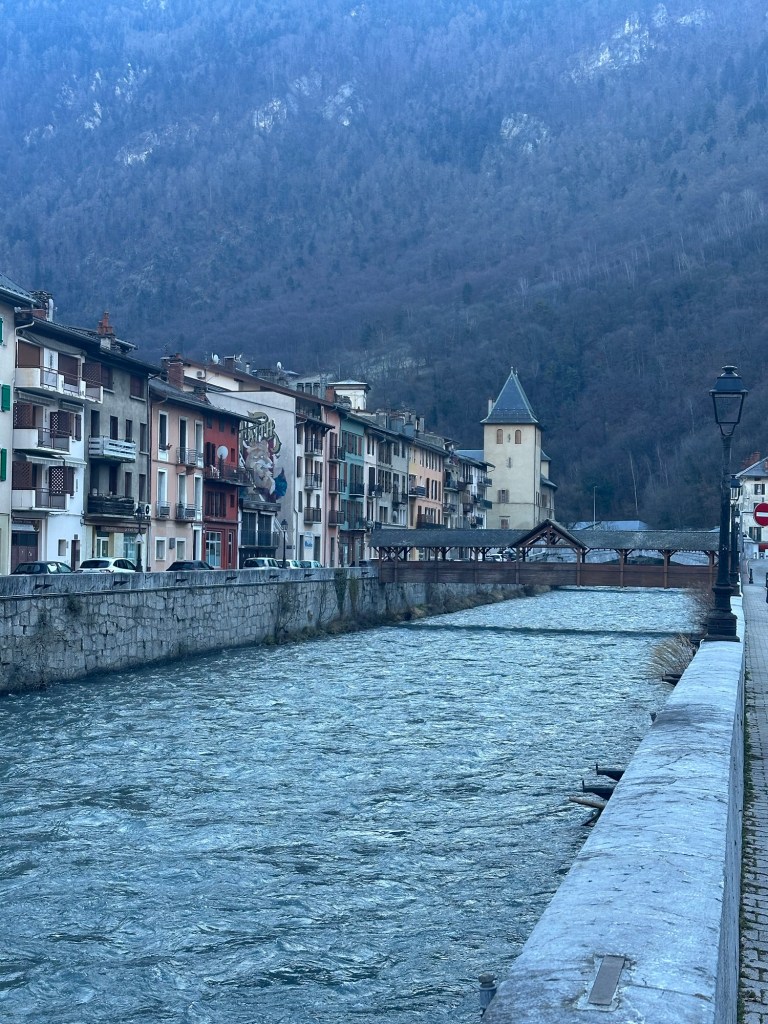 Our original trip plans had us leaving Thursday night and skiing for three days, but we were too tired to leave then and drove down Friday instead. We arrived mid-afternoon, and what can I say? The town of Moûtiers looks like it has seen better days. Our Airbnb was in a hotel down an alley, and it was definitely one of the more questionable places we’ve stayed. We were happy to find that the apartment was nice enough and clean, though. We unpacked and napped before having dinner in an Italian restaurant.
