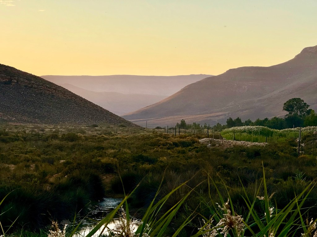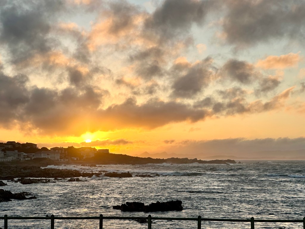 Thursday was our earliest day, and we woke up at 4 a.m.! This was the day we were doing a shark dive, and we needed to catch the early morning tides from Gaansbai, about a two-and-a-half-hour ride south. We napped in the car and arrived in time for a beautiful sunrise over the bay.