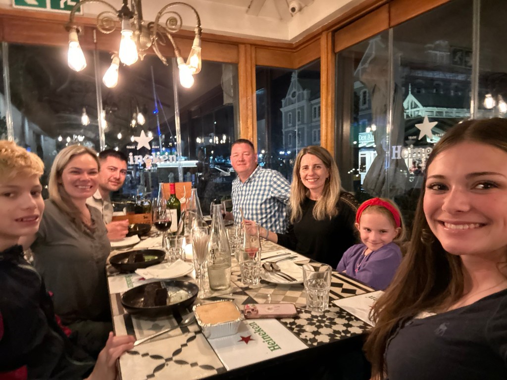 After our walk, we returned to the hotel, took showers, and then took a nap before returning to the waterfront for dinner. By coincidence, our neighbors from Germany were also in Capetown and had a schedule change that allowed us to cross paths. We made a dinner reservation and had a fantastic meal at La Parada. We had tapas, sushi, steaks, and desserts. It was one of the best meals we’ve had. Everything was so delicious, and not only that, it was so reasonably priced; it was such a surprise!
