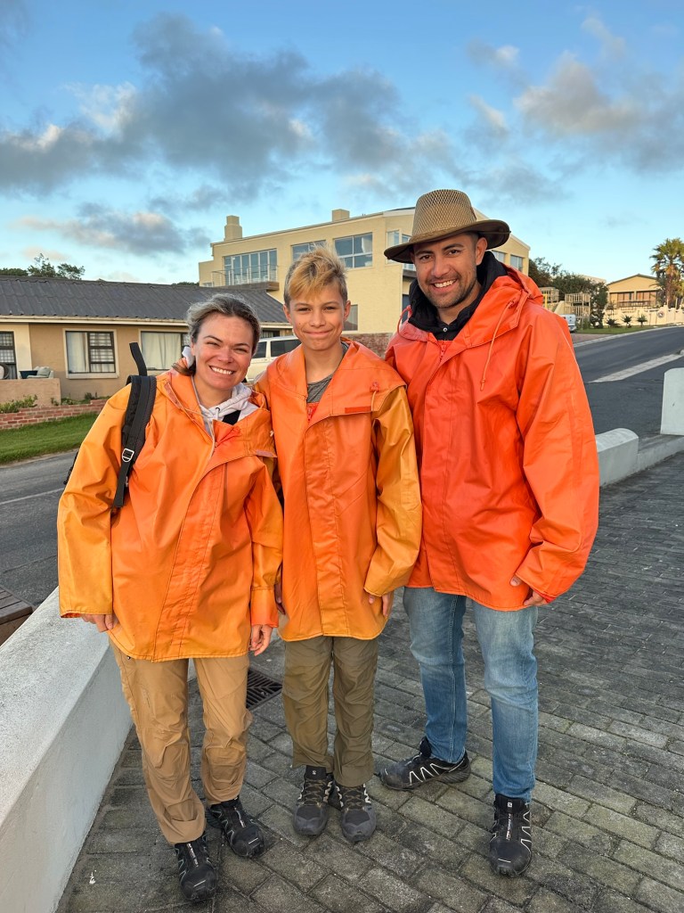 It was cold and so windy! They provided us with orange all-weather jackets, gave us the safety briefing, and we loaded up onto the boat. They warned us that the trip out would be really rough due to the high winds. Since there was no dock at Gaansbai, a tractor backed the boat on its trailer into the water, and the captain took us out into the bay. As there was no dock or harbor, our boat had to crest the huge incoming ocean waves. It was pretty scary, but the captain did a great job making it as smooth as possible. We did have one scary moment when some kelp got caught in the motors and they died while we were trying to get through the waves. The crew rushed to clear it before the boat was pushed into the rocks along the beach.