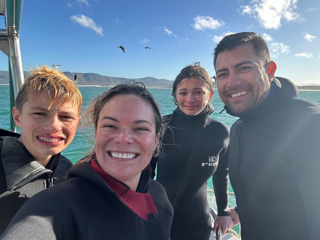 Our turn was over soon enough, and we climbed out to warm up. While the next group was taking their turn, Brooklyn’s seasickness started to get the best of her, and she needed to hug the side of the boat. The number of sharks started to die down as some sting rays, which are their predators, started coming around. With the wind and swells getting larger, our group passed on our second turn in the cage.