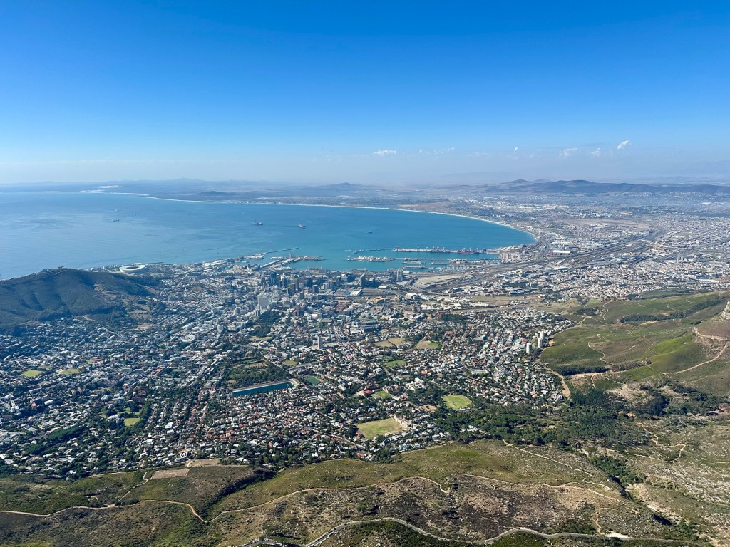 Once we were at the top, we did a one-mile circular hike, which allowed us to see the views in all directions. To the west, we could see the Atlantic Ocean to the east, False Bay, and into the south, the Cape of Good Hope. Cape Town surrounded the northern end of the mountain. It was a pretty warm day, so we stopped for ice cream after our hike and headed back down.