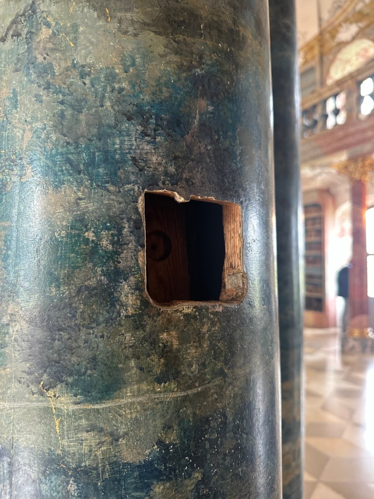 As I toured the second-floor library, I found myself wondering how the weight of the room was supported when it was full of so many marble columns. I soon found my answer when I found a column with a cut-out section. They are actually made of wood and painted to look like marble! Very cool and resourceful!
