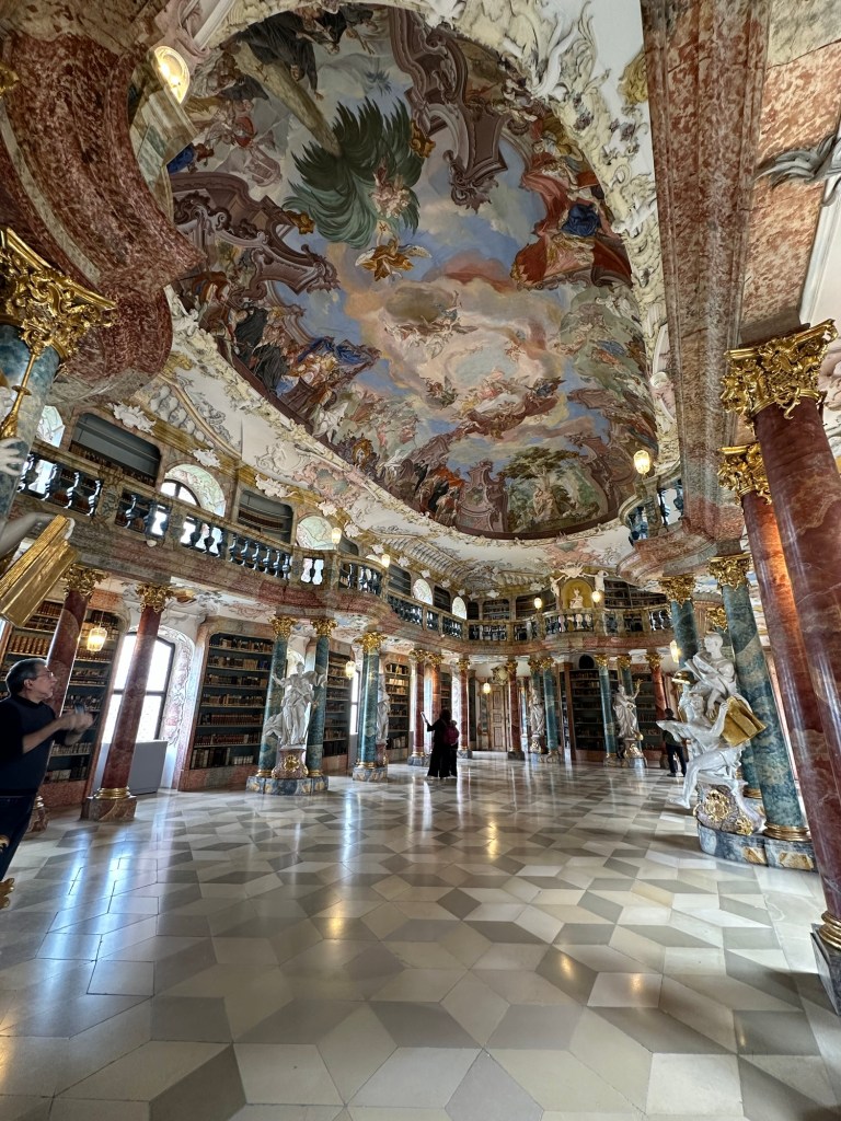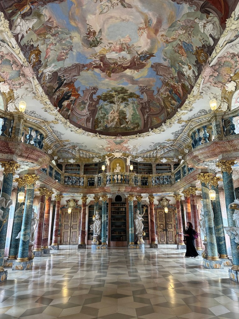 The Abbey is about an hour from our house, near Ulm, famous for its beautiful medieval library. The Abbey itself was founded in the 1000s. Wiblingen was renowned for being a place of higher learning and prosperity. Its prosperity led to a massive renovation push in the 1700s when the entire complex was rebuilt in the Baroque style. The library was one of the later completions and was done in the much fancier rococo style. I love visiting libraries and was excited to check this one out. Its style was SO EXTRA. The library didn’t seem to have much space for books but was full of marble statues, blue and red-toned Corinthian columns, a frescoed ceiling, and gilded trimming. It was A LOT to take in, but somehow, all the competing styles worked, and it was beautiful.