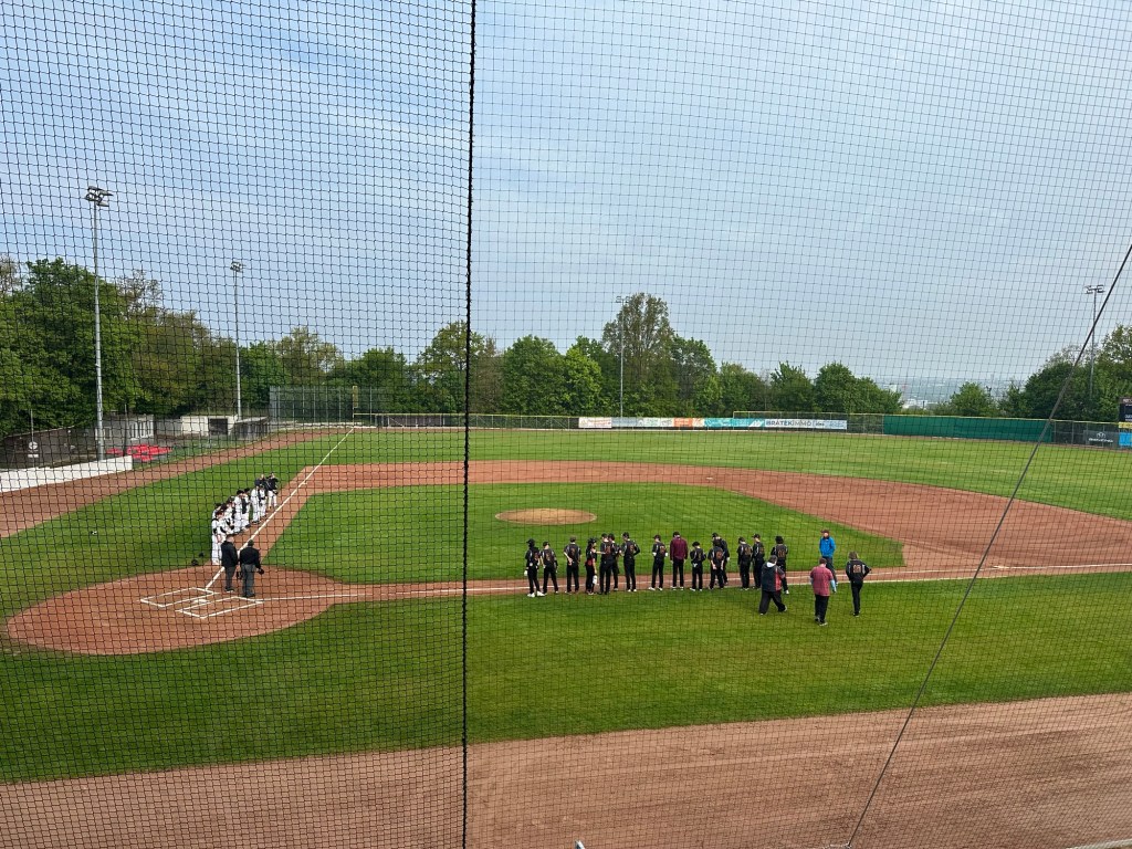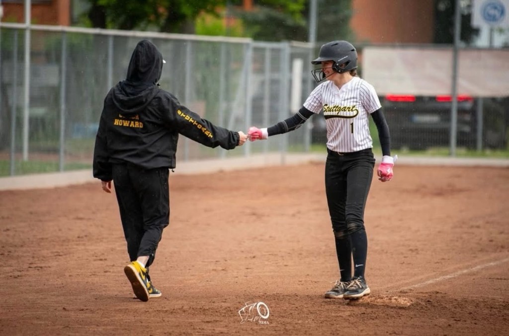 It was a doubleheader against Gammertingen, and their team has a fascinating backstory. Gammertingen is in an extremely rural area about two hours south of here, and it is strange that a village their size has such a robust softball and baseball program. A man from the town was diagnosed with a rare form of blood cancer in the 1980s. He had to go to America for treatment and took his son, who would be his blood donor. During their stay, the son fell in love with baseball. The dad fully recovered, and when they moved back to Germany, they started the club, which has now evolved into this huge program. The current team has the two daughters of the son who traveled to the US. Their team name is ‘The Royals’, and they use the same colors and design as the Kansas City Royals, where the dad received his treatment. Such a sweet story!