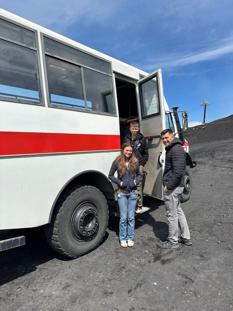 On Sunday, we gave ourselves a little grace and slept in a little before having breakfast and heading to Mt. Etna in the morning. Mt. Etna is Europe’s largest active volcano. It has been erupting regularly since 2022, with the most recent eruption occurring about two weeks ago. The eruptions are of slow-moving lava, though, so it is relatively safe to visit the volcano and even climb to the rim as long as you are with a guide. We did not start early enough to do the long and arduous hike up to the rim, which also requires a ton of professional gear, so we opted for the cable car, mountain bus, and guided tour around one of the craters.