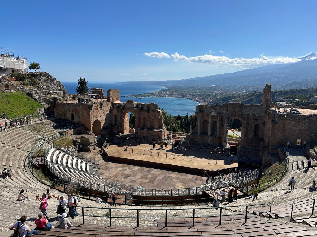 After walking the whole length of the town, we visited the ancient amphitheater. We climbed to the top immediately to see the beautiful views of Mt. Etna and the Mediterranean from the highest point in the theater. The theater still hosts shows to this day and was in the middle of setting up for a film festival.