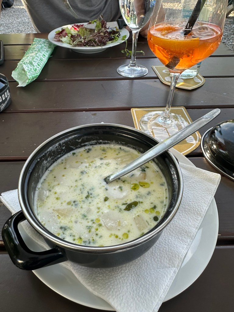 We are in the middle of Spargel season. Spargel is white German asparagus, and it’s white because as the plant grows, the farmers continue to meticulously cover it with soil so it never sees the sun and produces chlorophyll. Because it’s so labor-intensive to grow, the season in Germany is limited to only mid-April through June 14th. We’ve been trying to take advantage of it as much as possible, so Matt and I visited The Boathouse biergarten and got soup on Monday night when both kids were busy.