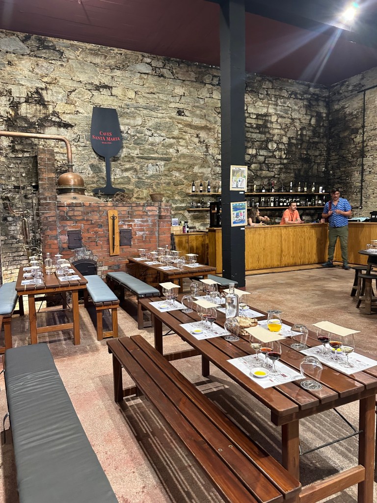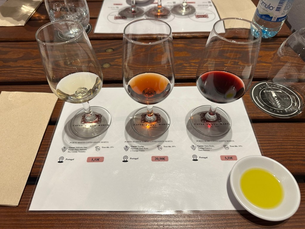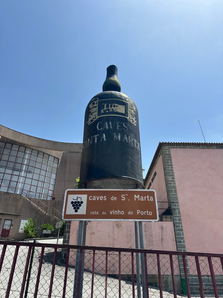 Our first stop of the day was Caves Santa Marta. We got a tour of the caves and learned about different types of Port Wine: white, tawny, and ruby, and how they are made. To get the deep red color of ruby port, the wine is stored in huge 550-liter vats. This means the wine has less contact with oxygen at the surface and with the oak of the barrels. The tawny and white port is stored in more normal-sized barrels, which gives it more access to oxygen and the oak. One unique part of the production process is that once the wine has reached the desired sweetness, a grape spirit, such as grappa or distilled alcohol, is added to stop the fermentation. The result is a sweet dessert wine with higher alcohol content. Port’s sister drink is Sherry, which is made the same way in Spain.