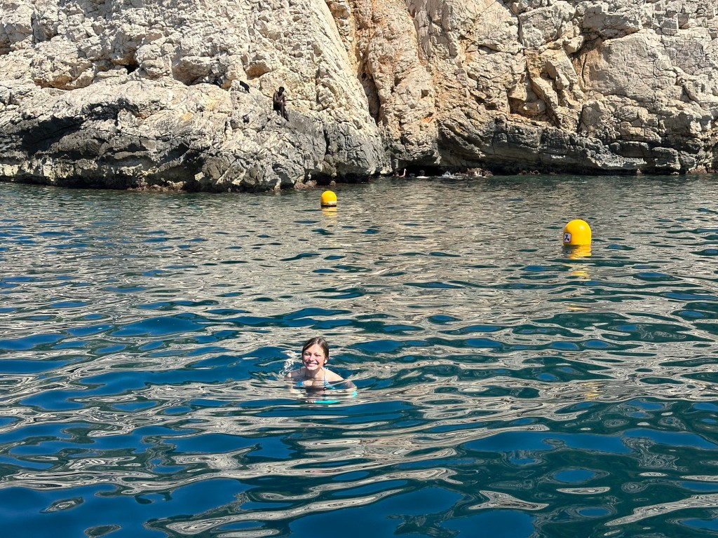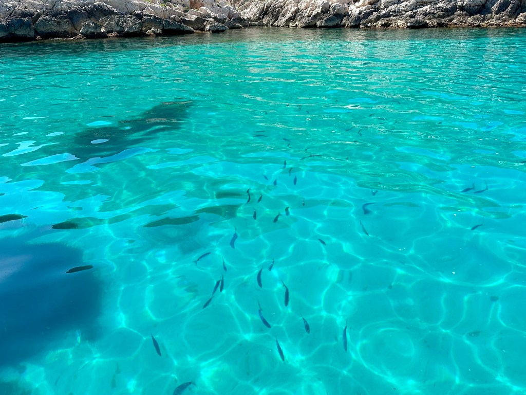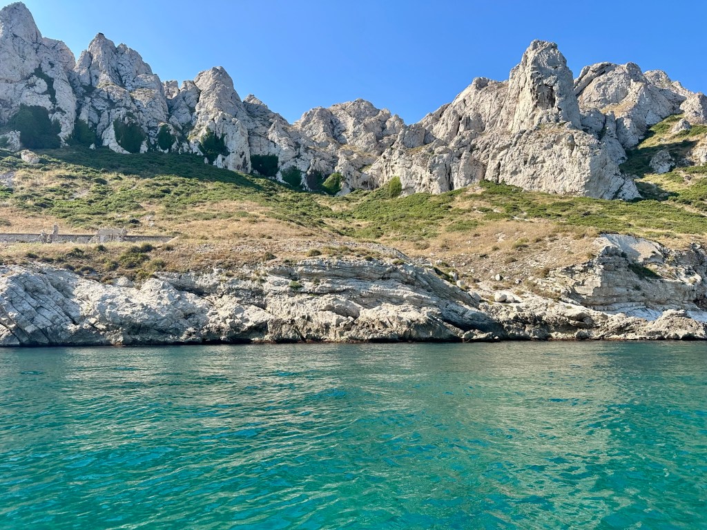 The boat continued through the Riou Archipelago, which is made of several rocky limestone islands, and then into Calanques National Park. ‘Calanque’ is the French word for creek, and because of the limestone geology, the water is incredibly clear and bright turquoise. First, we visited a lagoon with a ‘Blue Grotto.’ The cave can only be entered by swimming through a small entrance, only big enough for your head to be above water, as long as there are no waves.