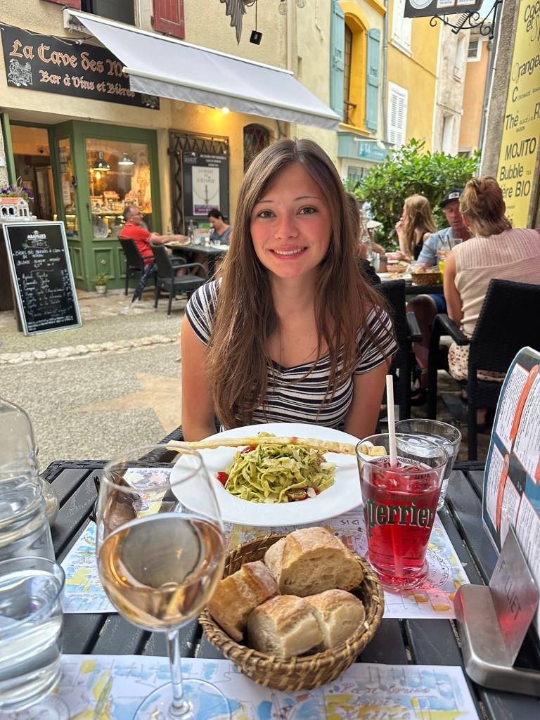 We alternated between swimming in the chilly water and lying on our towels with books before heading back to the apartment and lying by the pool for a few hours. When it was dinner time, we headed back into Moustiers and walked around the town before grabbing dinner in a cute corner restaurant with only a few tables. I had a burger, Brooklyn had pesto, and then we shared a crème brûlée.