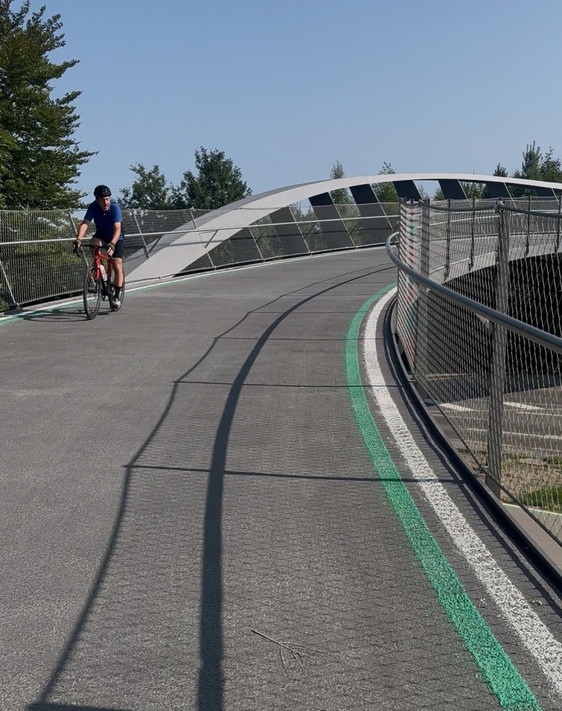 We finally left the house on Sunday. Matt planned a 60-kilometer bike ride, and we started around 9 AM. We first drove north, taking the new bicycle bridge, which, after two years of construction, was recently completed.