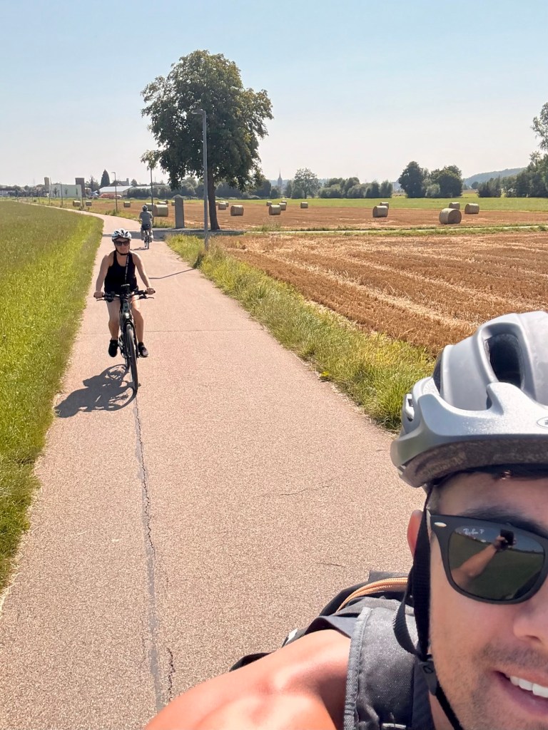 Next, we biked through the town of Renningen and then to our final destination, Weil der Stadt. Weil der Stadt is a half-timbered medieval town known as the birthplace of Johanas Kepler. Typically, WdS is about a 30-minute drive from our house. Of course, we went the long way around, but it took us about two hours to get there on a bike. By the time we reached it, we were really thirsty and headed to the town center to find a café. It’s always easy to find the action in a new town; just go towards the church steeple, where there’s always a large square with many restaurants! 😅