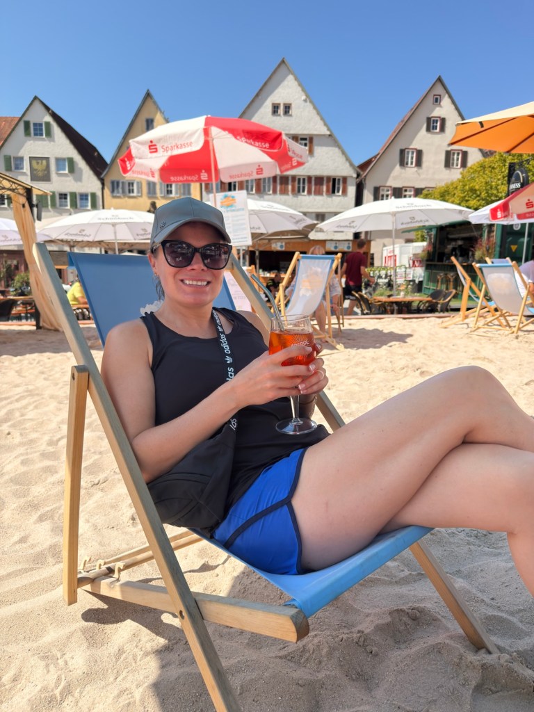 We found the market square and were surprised to find it had been transformed into a beach! The city had brought in truckloads of sand, filled the platz, and put out beach chairs and umbrellas. It was filled with many families and kids playing in the sand. We grabbed some drinks, relaxed a while, and then headed back home.