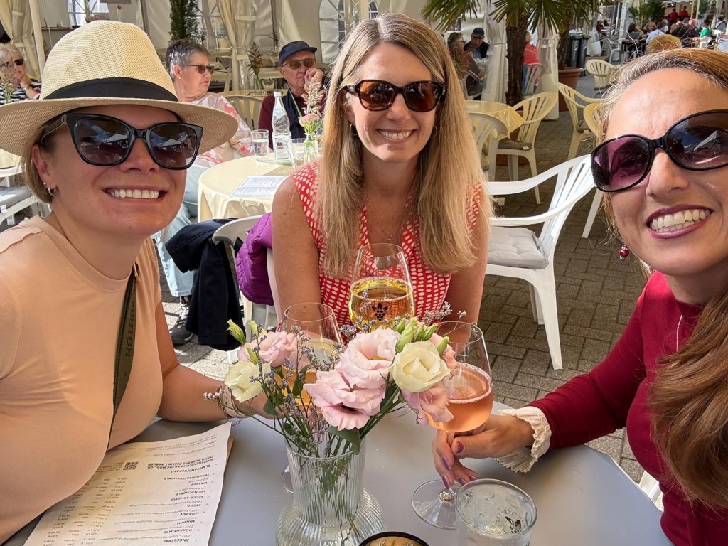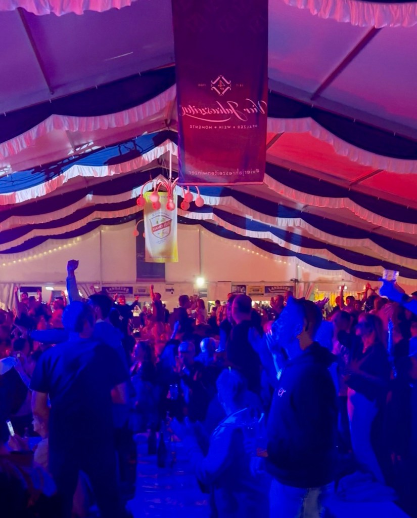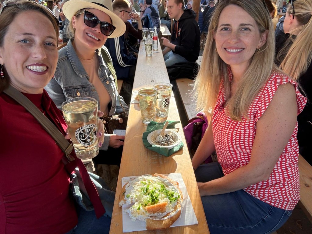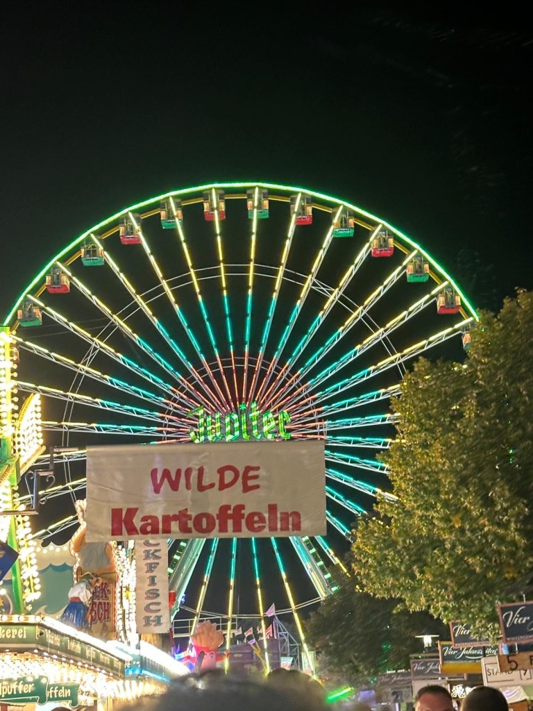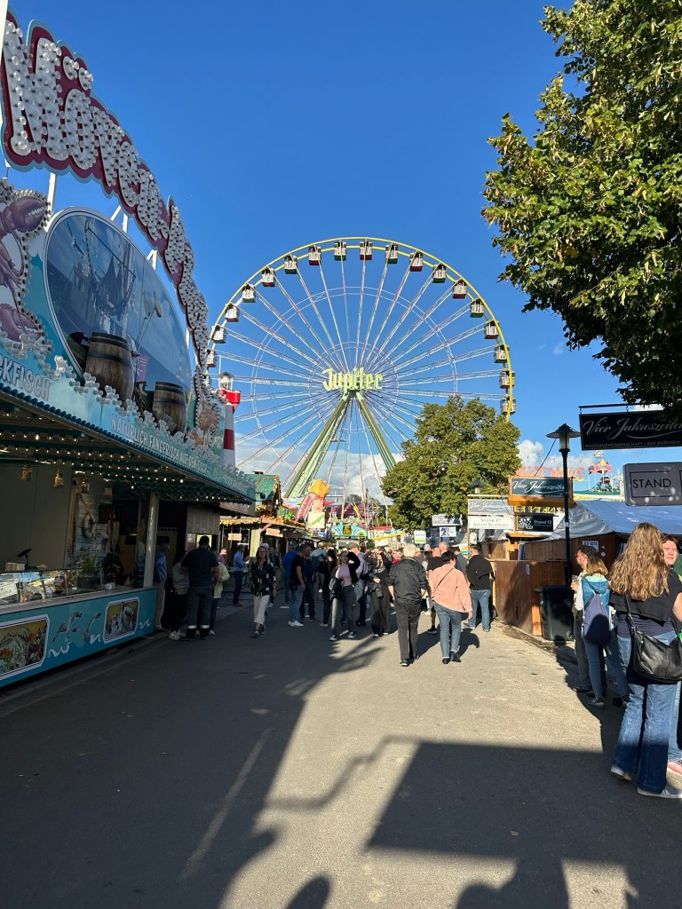 We kept wandering until we heard the sweet sound of a band belting out Sweet Caroline from a nearby tent. There was no question—we had to get inside ASAP. Once we stepped in, it was exactly what you’d expect from a traditional beer tent: a lively Schlager band playing and people standing and dancing on benches. The only difference was instead of giant beer steins, everyone was prosting and drinking from giant mugs of wine Schorles, raising them high as the crowd sang along.