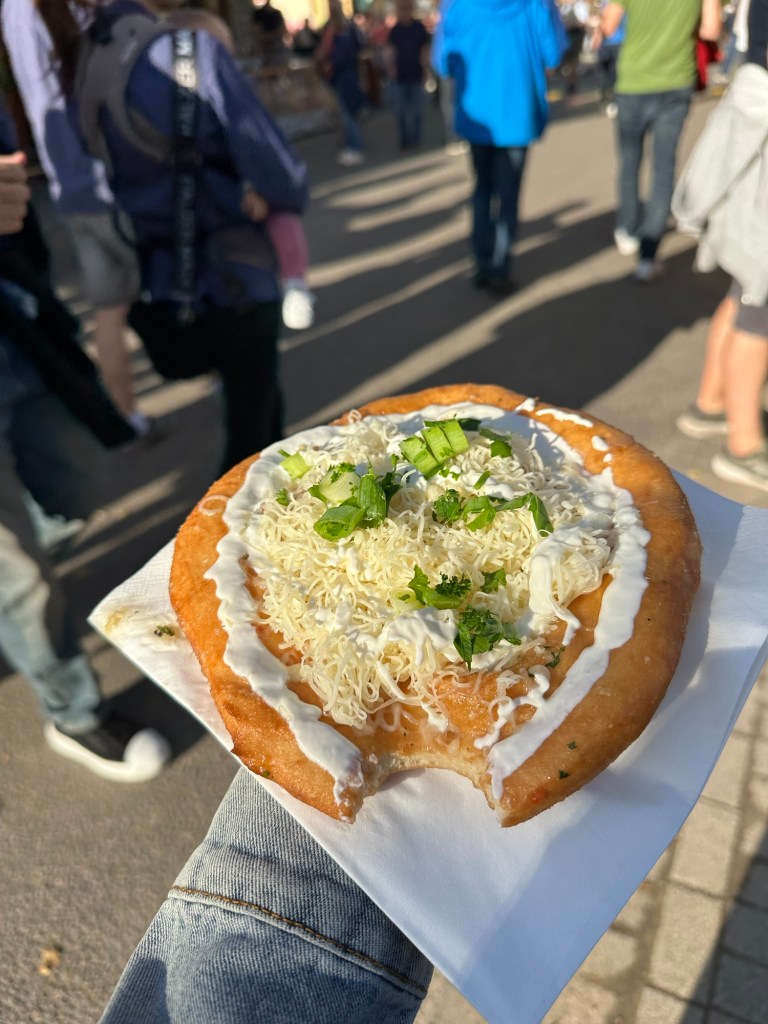 After the wine garden, we were starving, so we made our way to an area packed with food stalls and long wooden benches and tables for eating. That’s when I spotted my favorite festival food—Langos. Originally a Hungarian dish, Langos can now be found at just about every festival and fair in Europe. It’s a made of deep-fried dough smothered in sour cream sauce, melted cheese, and heaps of minced garlic. The version here was different in that they added “Kräuter”—a fresh mix of parsley and chives—sprinkled generously on top. And oh my gosh… it was next-level delicious. I haven’t stopped thinking about it since.