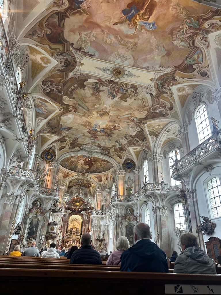 My first stop was Birnau Basilica which is a gorgeous Baroque church sitting on a hill above Lake Constance, with views of the lake and the surrounding vineyards. Inside, it’s full of intricate stucco work, gold accents, and colorful ceiling frescoes. I got a late start that morning so arrived just as the noon-time bells were ringing. Whenever I visit German landmarks on weekdays, I always expect to be the only person there and am always surprised when I find a place packed. I could barely find a parking spot since the parking lot was full of cars and busses- Germans really love their culture! I took a few photos of the outside and made my way inside the basilica to find myself in the middle of an active service in honor of German Unity Day.