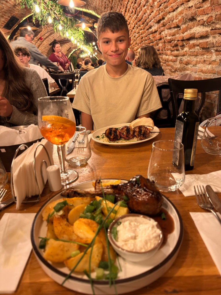 We settled into the rustic cellar for a traditional Romanian meal. I had the turkey leg cooked in red wine, Matt went for the pork ribs, and the kids had chicken kebabs. For dessert, we shared papanash—Romanian doughnuts topped with cream and jam—and pavlova, a cloud of cream-covered fruit. That Romanian cream was incredible! The only way I can describe it is as a sweeter, thicker version of whipped cream. Afterward, we headed back to the hotel, more than ready for some much-needed rest.
