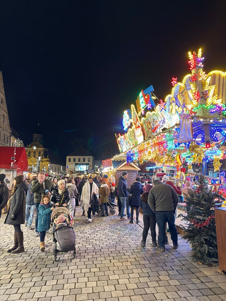 While the city’s population may be smaller, the place was packed! People must have come from all over the region that night for the huge Christmas market. We couldn’t find parking for almost thirty minutes and had to wait for a spot to open in a garage before we could enter. Then, we navigated the crowded streets to the market.
