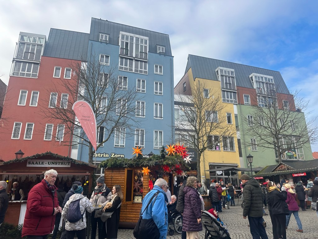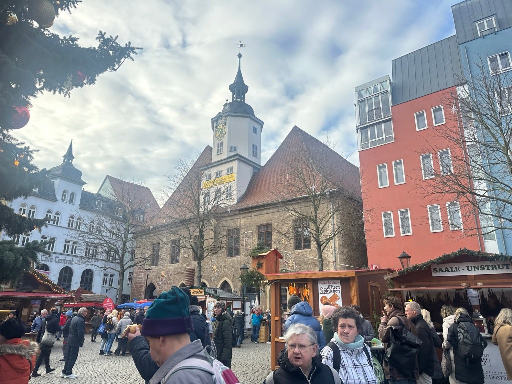 We continued our trip to Jena, our first city stop in the German state of Thuringia. Jena is a vibrant university city in Thuringia, Germany, known for its strong academic and scientific community. The city features a mix of historic architecture, including Gothic and Baroque buildings, alongside stark modernist structures from the Cold War era, when it was part of East Germany. The first thing we noticed was the loads of cold-war era apartment buildings and TV tower.