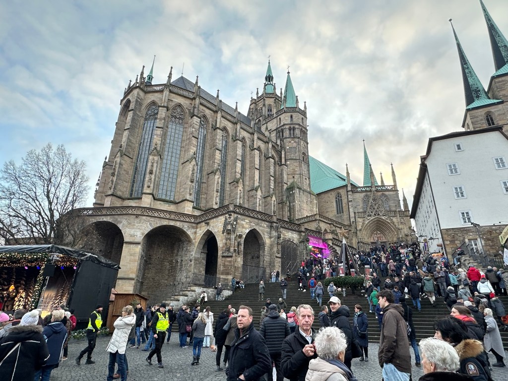 Our final stop was in Erfurt. Erfurt is the historic capital of Thuringia, Germany, known for its well-preserved medieval old town and charming cobblestone streets. Its highlights include the Erfurt Cathedral where Martin Luther was ordained and the Church of St. Severus next door where Luther was first a catholic monk before he went on to start the Protestant Reformation, and numerous Gothic and Renaissance buildings that reflect the city’s rich architectural heritage.