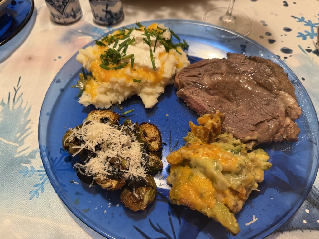 We made lots of FaceTime calls to our family in the afternoon, then got started on our Christmas dinner. Matt bought a rib roast and found a delicious red wine sauce recipe. We had mashed potatoes, broccoli casserole, and fried Brussels sprouts. It was so good!