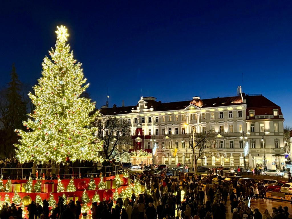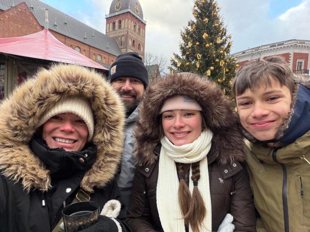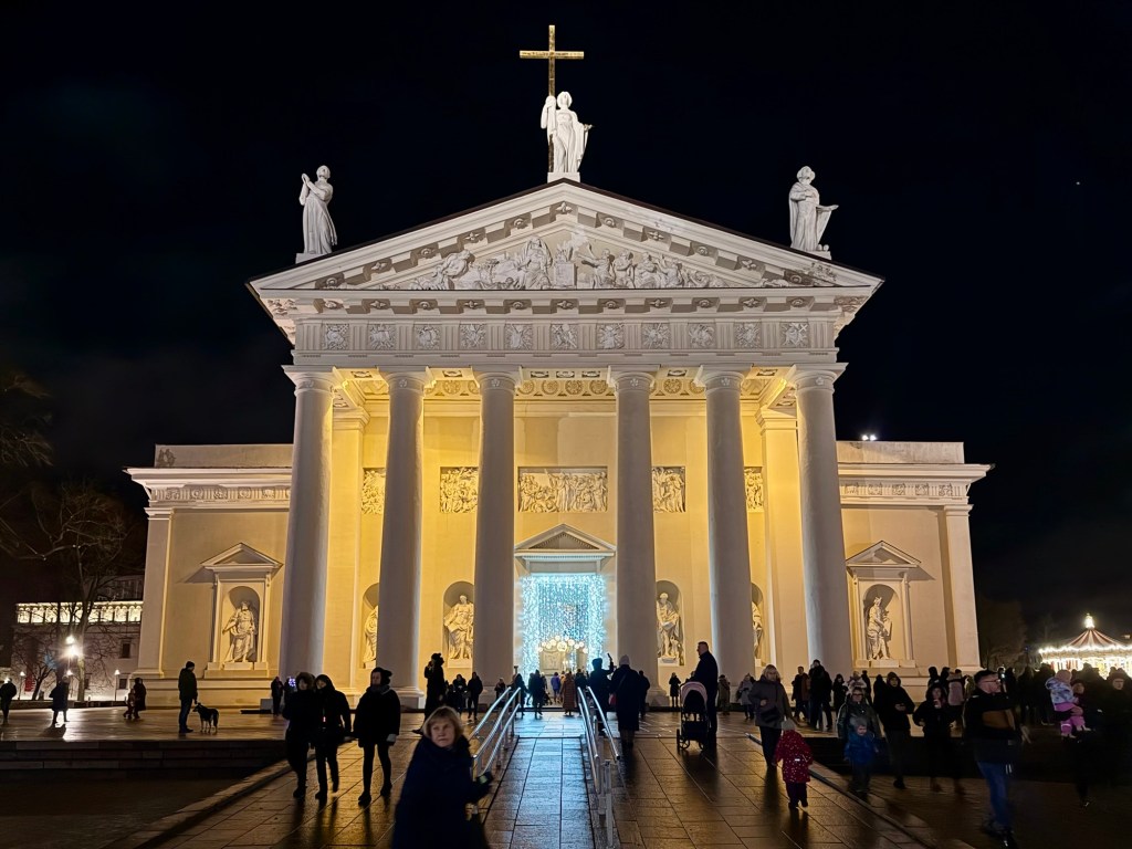 Matt and I got glühweins (sadly in plastic cups) and the kids got snacks while we walked the market. It was small so it didn’t take that long. It turns out, Vilnius is the European Christmas Capital of 2025 so everything was beautifully decorated and we really enjoyed the atmosphere.