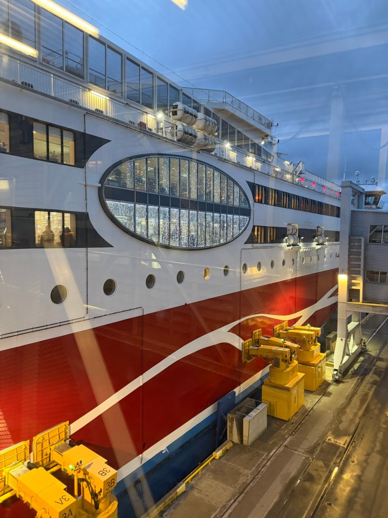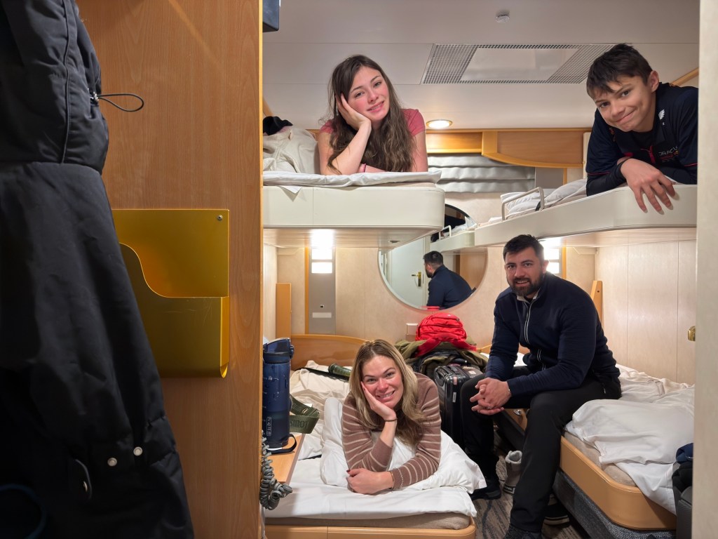 The ferry had multiple restaurants, bars, clubs, and a massive duty-free shopping area. As soon as the boat left port, Matt and I rushed to buy wine, joining the frenzy of people grabbing tax-free alcohol. After exploring the ferry, we decided the best place to relax was actually in our cabin, where we spent time listening to a true crime podcast and playing cell phone games. We all agreed it ended up being one of the most relaxing parts of the trip!