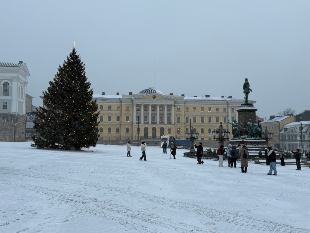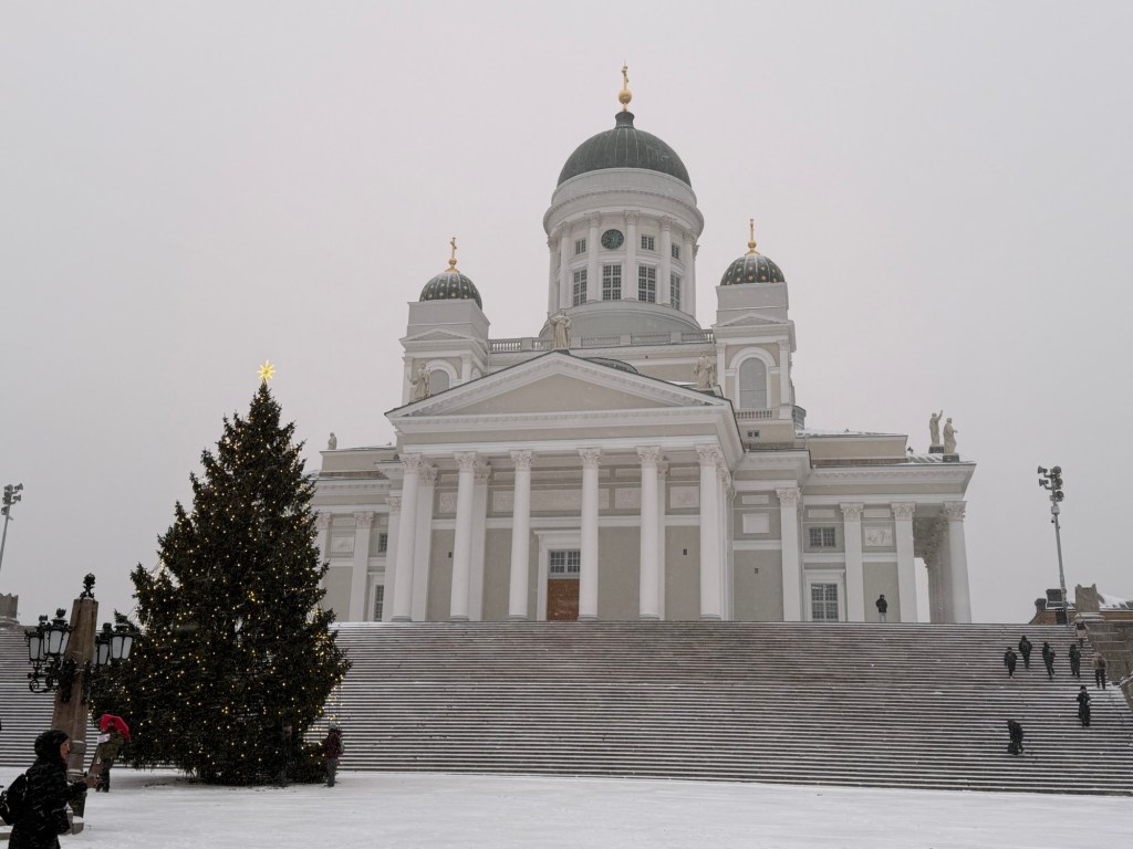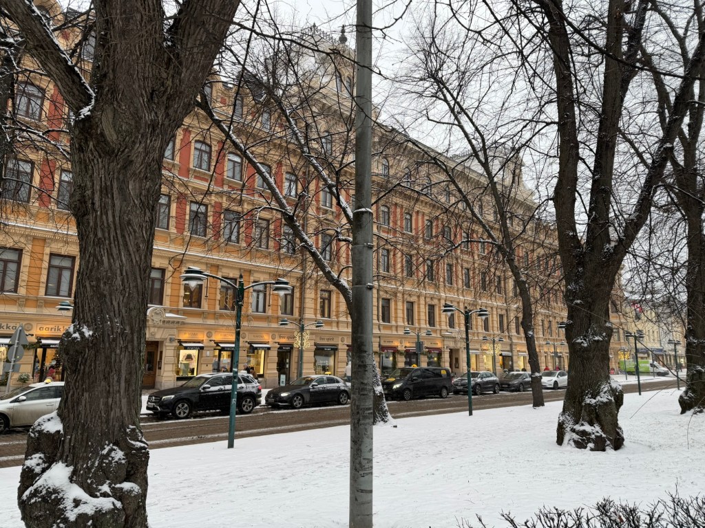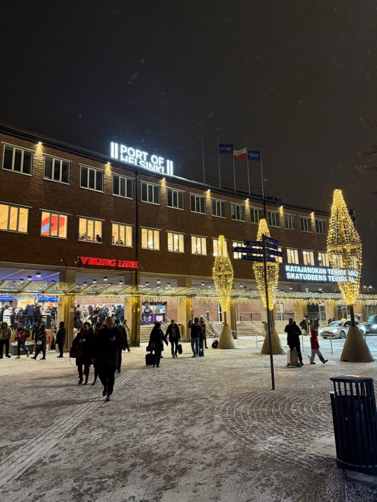 When we arrived in Helsinki, it was snowing and about 10 degrees colder. We lined up to disembark the ferry but had to wait a while because of the huge crowd wheeling trolleys full of alcohol off the boat. I’d read that some people take the ferry just for the chance to buy tax-free alcohol, and that definitely seemed to be the case.