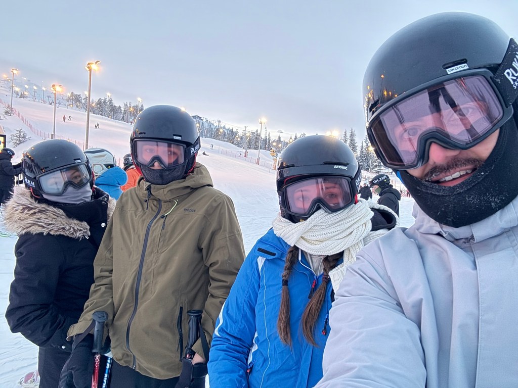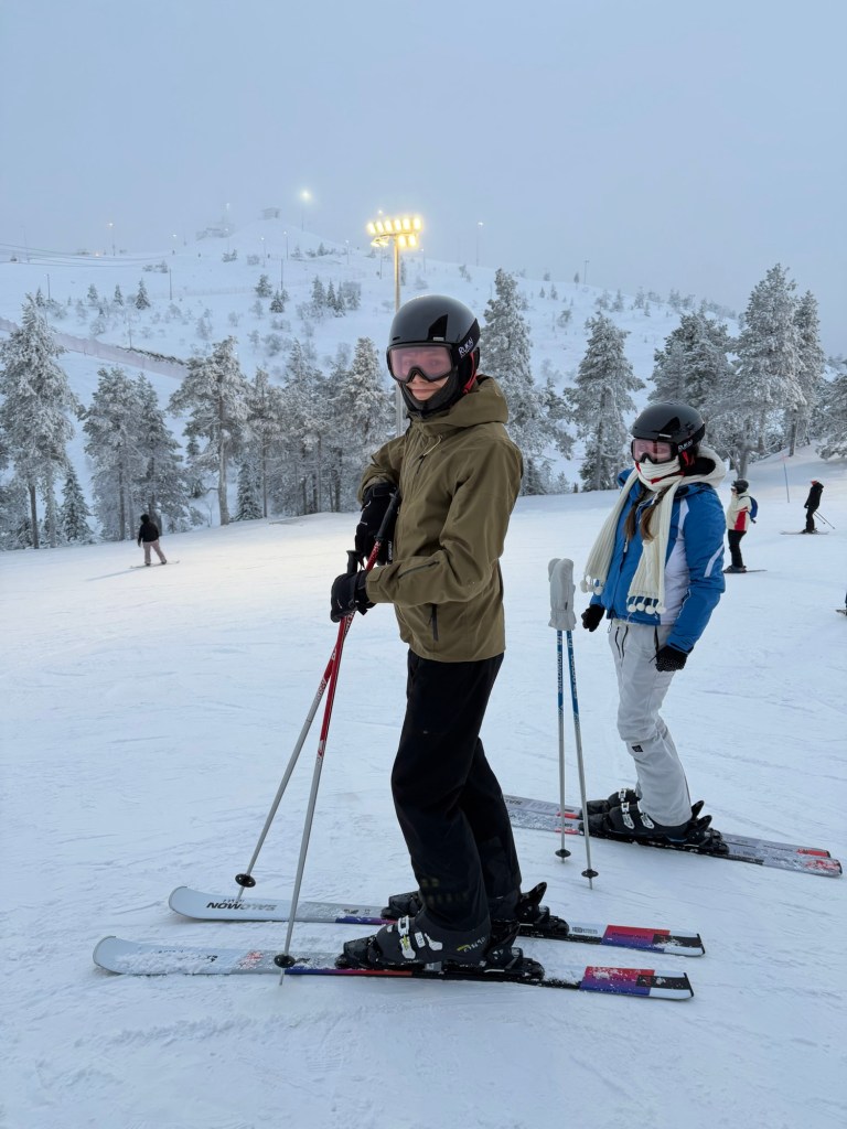After our nap, we did a few more night runs and then turned in the skis and went in search of dinner in Ruka Village. We found a pizzeria with an open table and had delicious pizza and tiramisu, then went back to the room to watch some TV until it got closer to midnight.